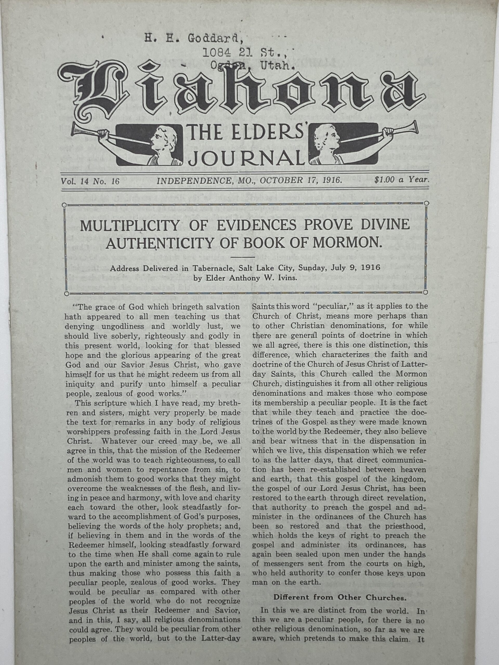 Fair condition staple bound pamphlet/magazine with signs of age. Bent/torn Edges. Stains and discoloration on the covers. Address stamped on front cover. Clean text.