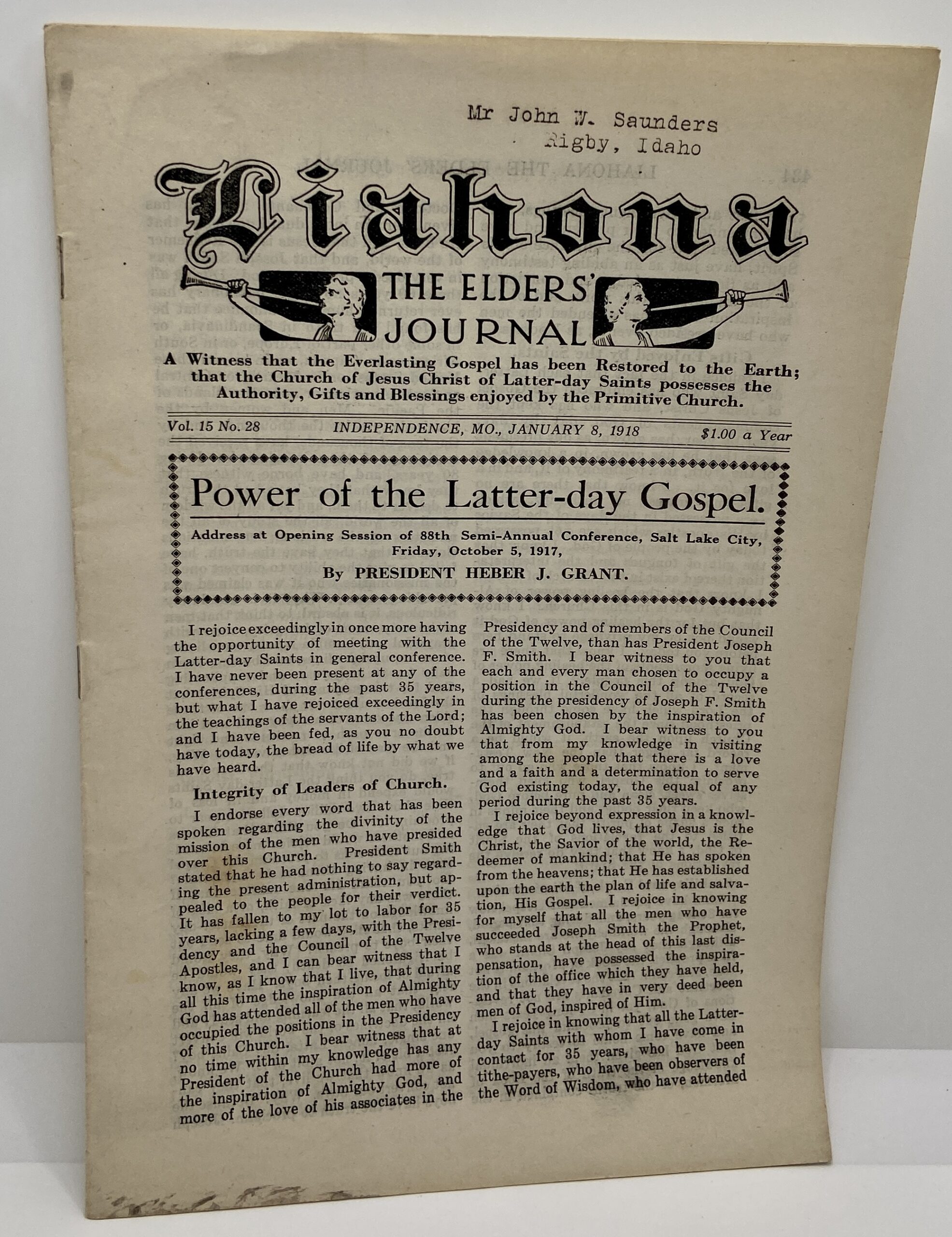 Fair condition staple bound pamphlet/magazine with signs of age. Bent/torn Edges. Stains and discoloration on the covers. Address stamped on front cover. Clean text.