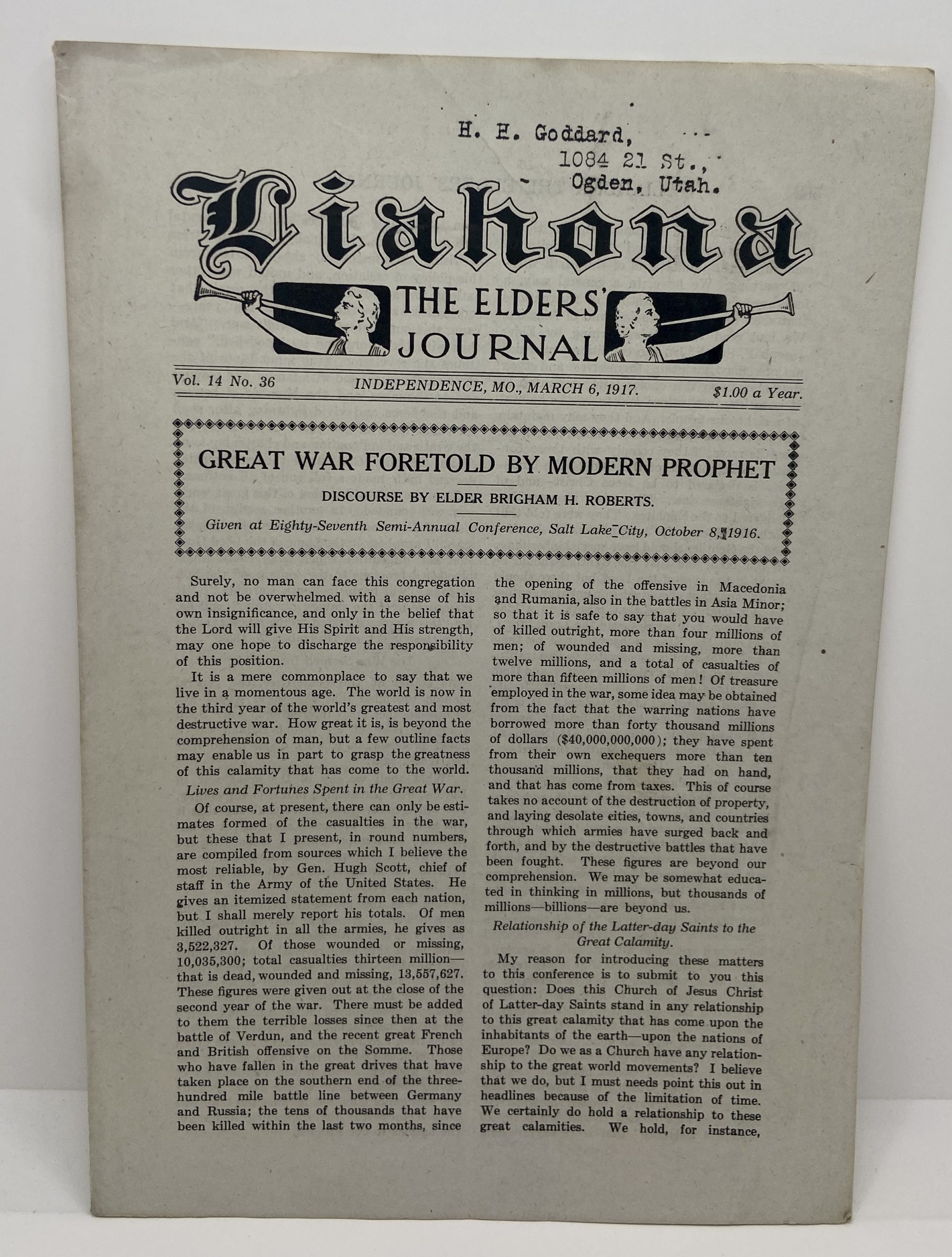 Fair condition staple bound pamphlet/magazine with signs of age. Address stamp on front cover. Stains and discoloration on the covers. Clean text.