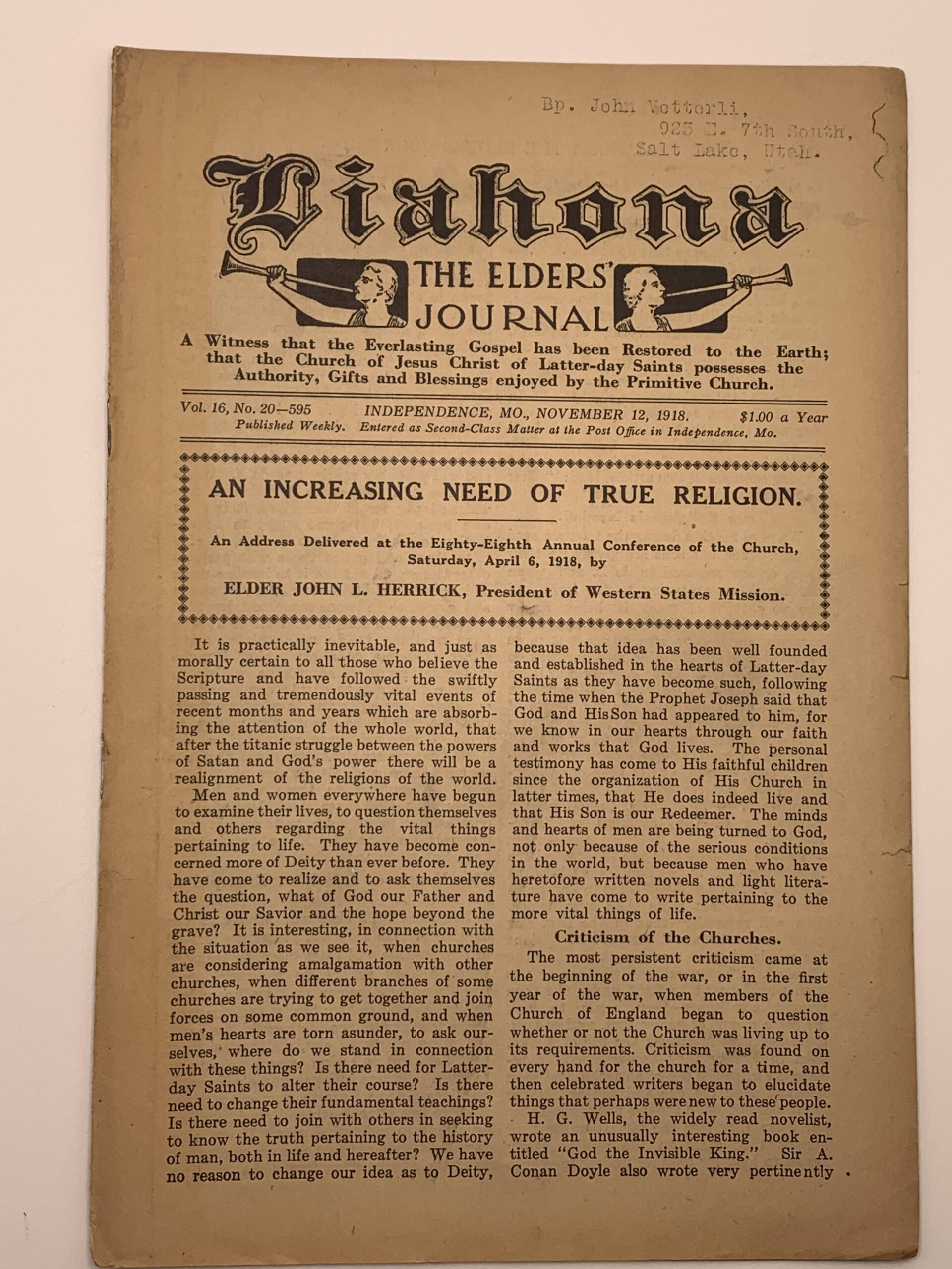 Fair condition staple bound pamphlet/magazine with signs of age. Bent Edges. Address sticker on front cover. Stains and discoloration on the covers. Clean text.