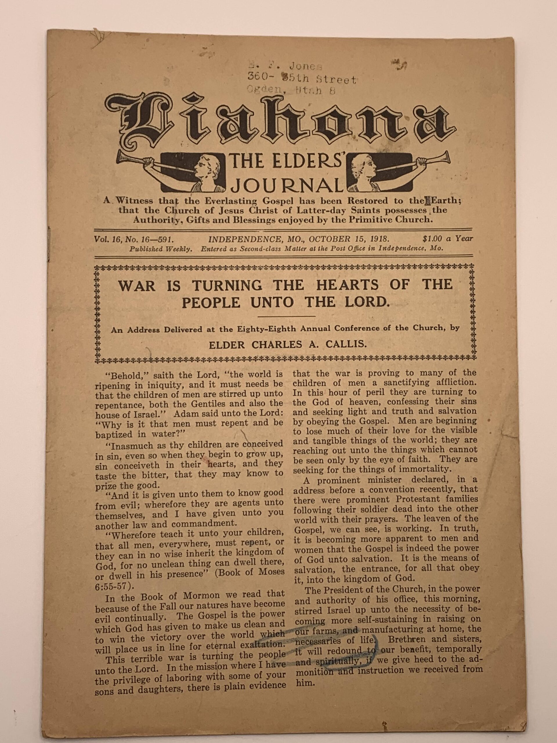 Fair condition staple bound pamphlet/magazine with signs of age. Bent Edges. Address sticker on front cover. Stains and discoloration on the covers. Clean text.