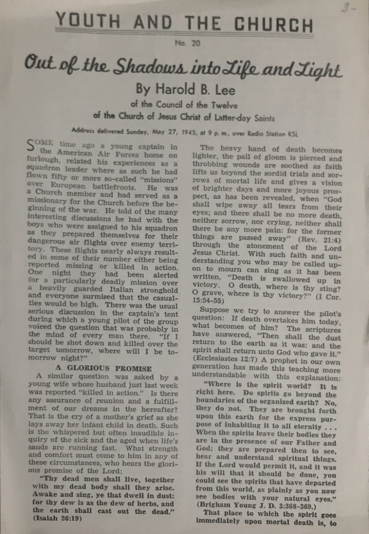 / May 27, 1945 ~ Harold B. Lee ~ Youth and the Church No. 20 ~ Out of the Shadows into Life and Night