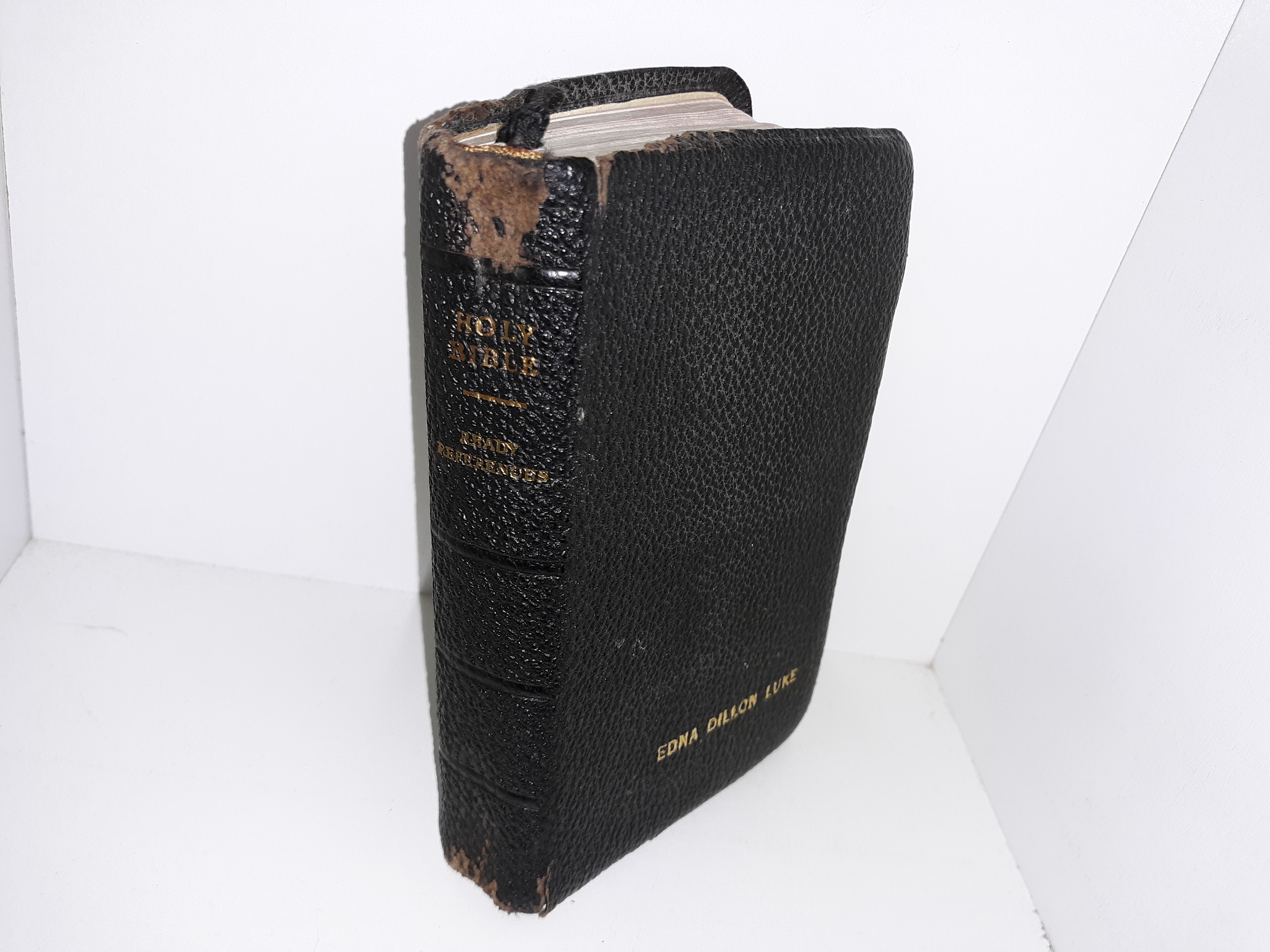 Fair condition, small, black, leather-bound book. The cover has scuffing, the name of a previous owner engraved upon it, some pieces torn off, and some tears. The front flyleaf has been torn out, but is still included. The pages throughout have tears, tape, stains, small tears at the edges, and notes written in pen.