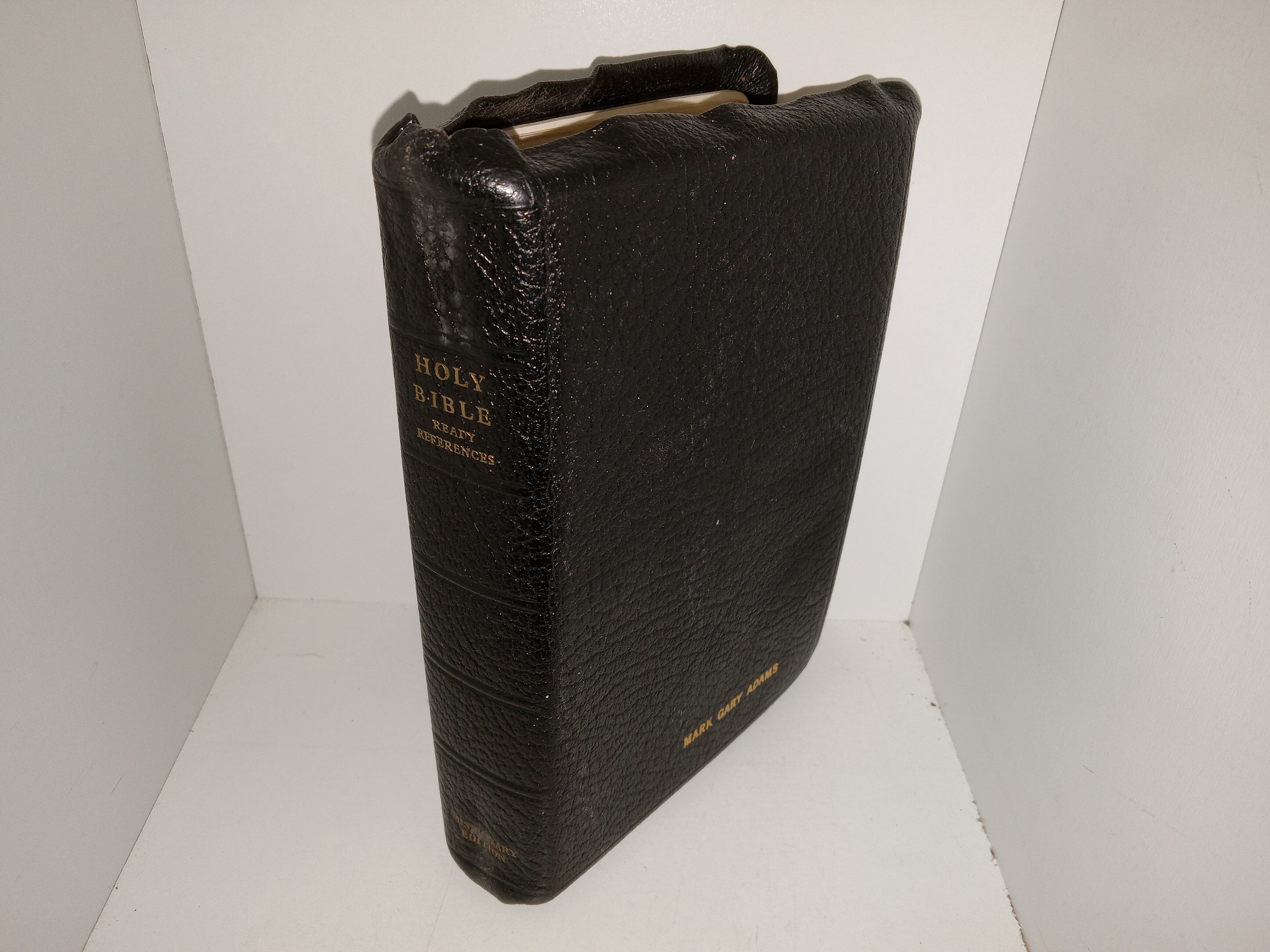 Fair condition, black, leather-bound book. The cover has the name of a previous owner engraved on the front, a deep scratch on the front, and some scuffing. The internal binding is torn and loose. Some pages have small tears on the edges, stains, highlighting or marks in pencil, many tiny stickers, or wrinkling. The front and back flyleaves have some residue, and scuffing. The second flyleaf has writing in pen and pencil, and eraser marks.