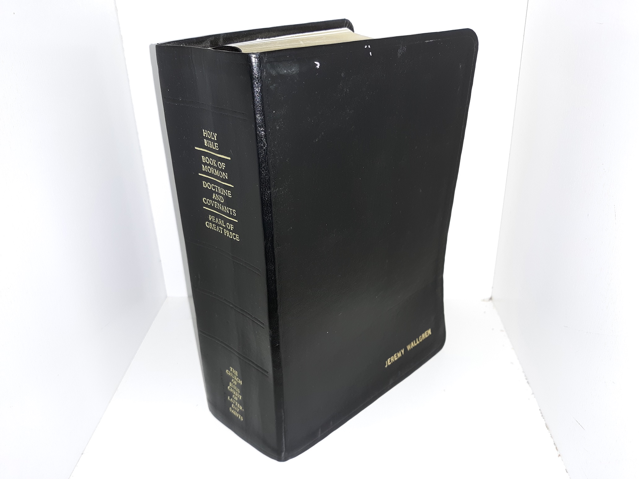 Good condition, thick, black, leather-bound book. The cover has the name of a previous owner engraved upon it, some deep, but small scratches, and some residue. The second flyleaf has a tear, wrinkling, scuff marks, and some writing in pencil. Some pages are creased, or have highlighting written in marker.