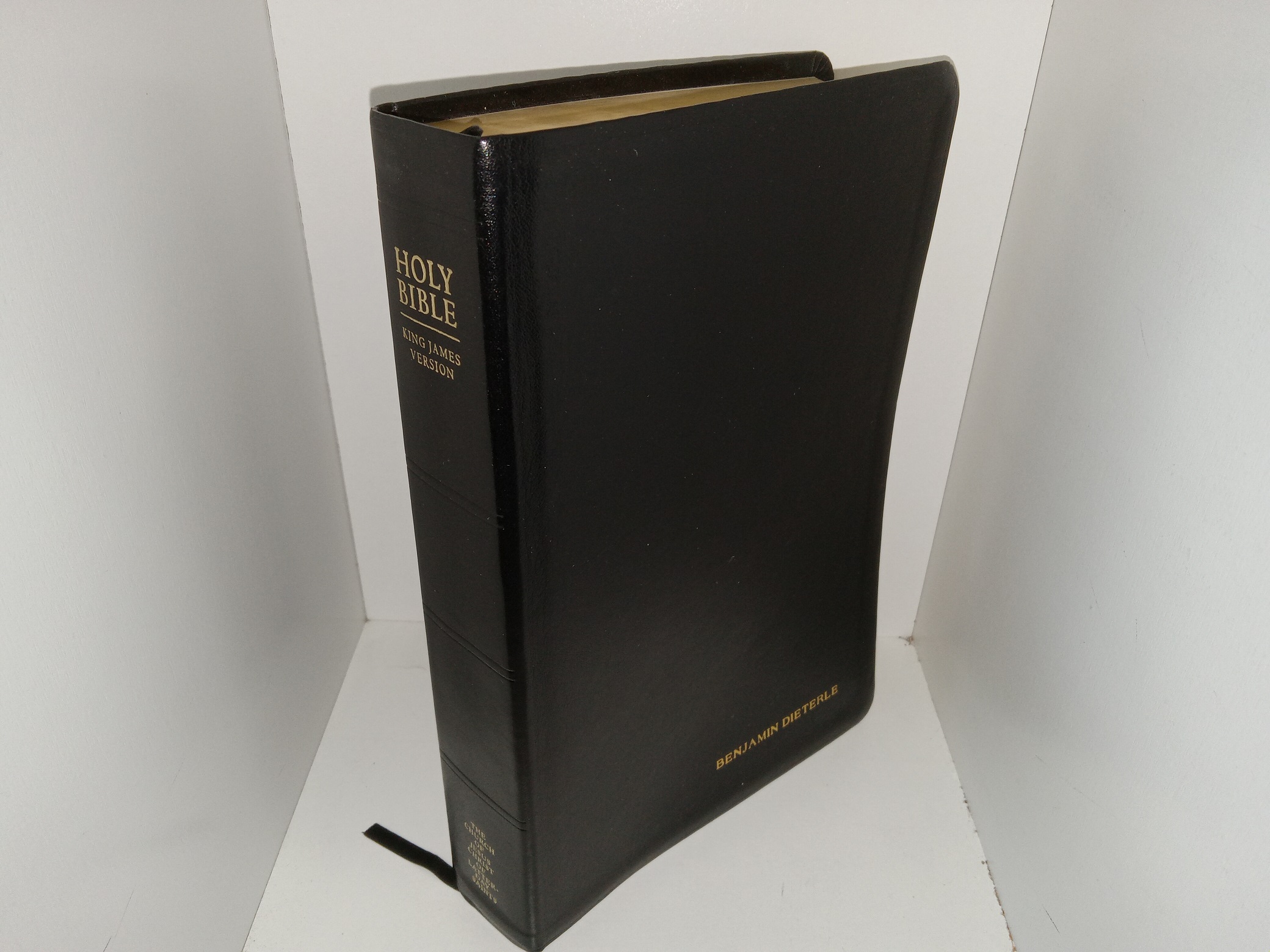 Good condition, black, leather-bound book. The cover has the name of a previous owner engraved upon it. The second flyleaf has writing in pencil. Text and illustrations throughout are clean, clear, and legible.