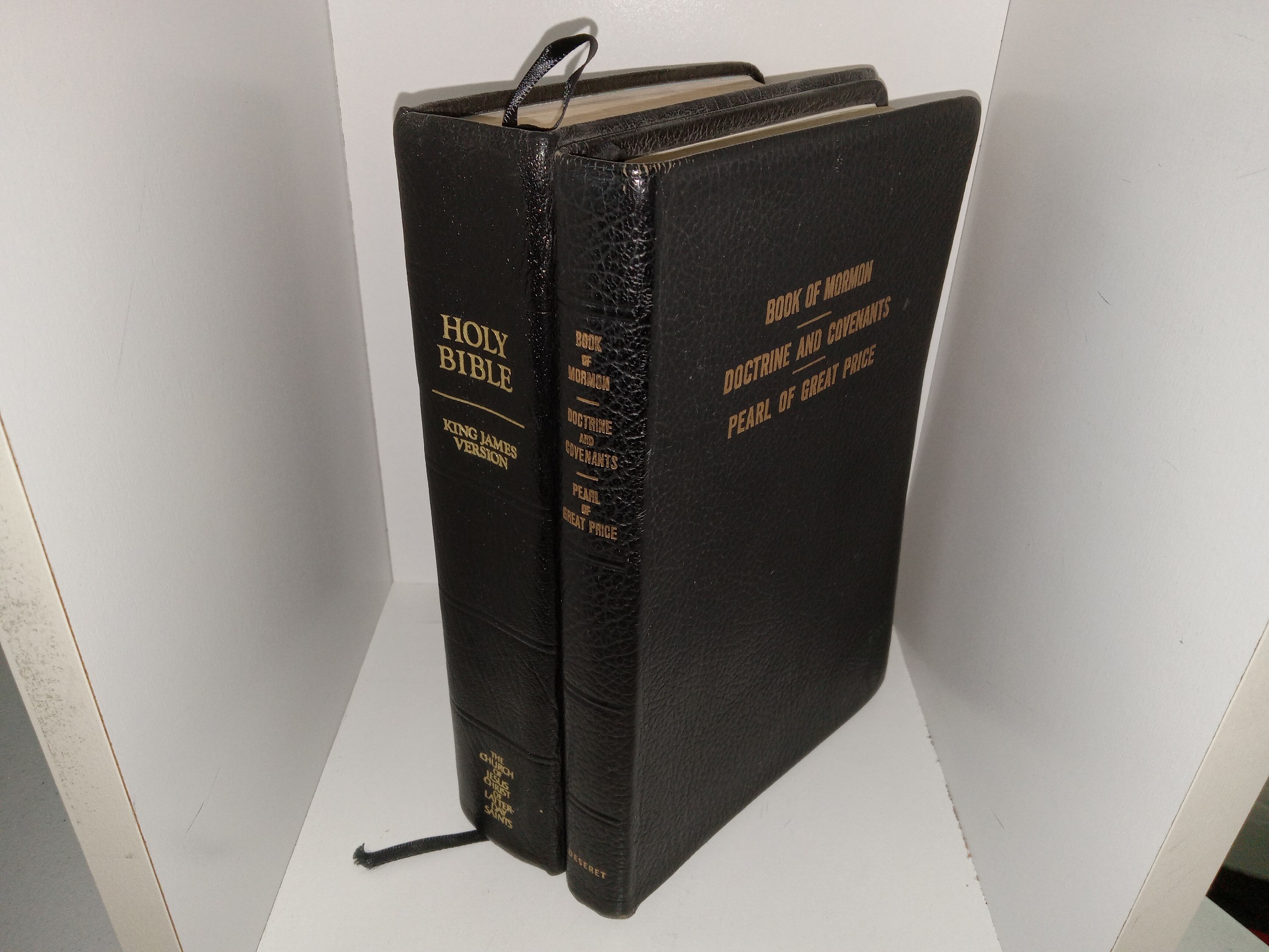 2 fair-good condition, black, leather-bound books. The covers have some scuffing and fading. Some pages have creases or wrinkling. The front flyleaf of the triple combination has an old address sticker on the back. The flyleaves have writing in pen or pencil. Text and illustrations throughout are clear and legible.