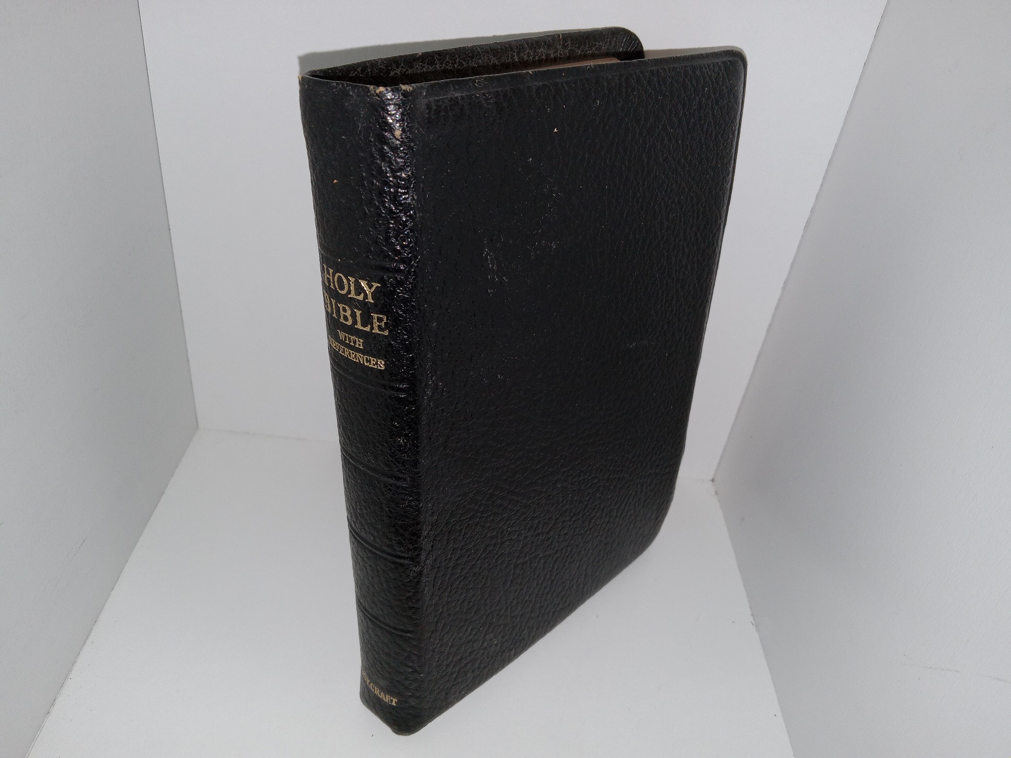 Good condition, black, leather-bound book. The cover has some minor scuffing at the corners, edges, and on the spine. The edges of some pages have scratches. The third flyleaf has writing in pencil. Text and illustrations throughout are clean, clear, and legible.