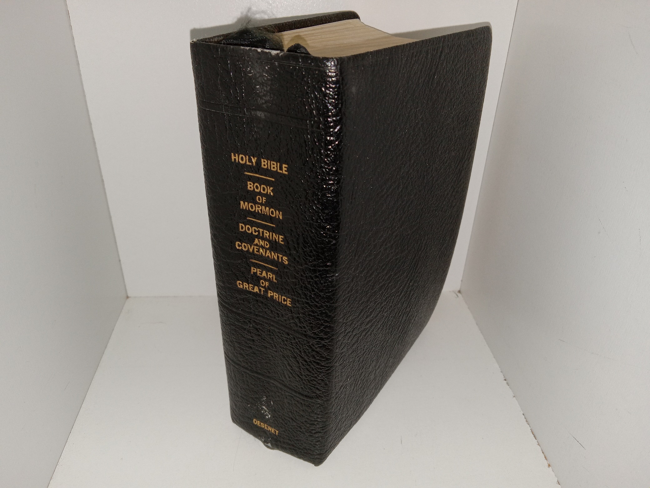 Fair condition, thick, black, leather-bound book. The cover has scuffing on the spine and edges. The ribbon bookmarks have fraying. There are notes, marks, and highlighting written throughout the book in pen, pencil, and marker. Some pages also have creases, or scuffing along the gilded edges.
