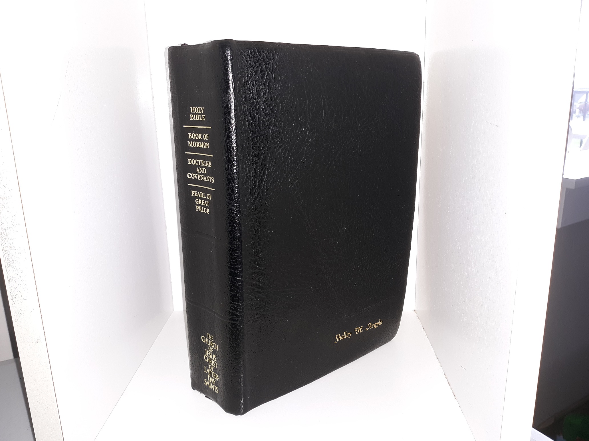 Fair condition, thick, black, leather-bound book. The cover has the name of a previous owner engraved upon it, and some scuff marks. The front inside cover has a long, diagonal tear. The flyleaves have some creases. The second flyleaf has writing in pencil. There is highlighting throughout the book in marker.