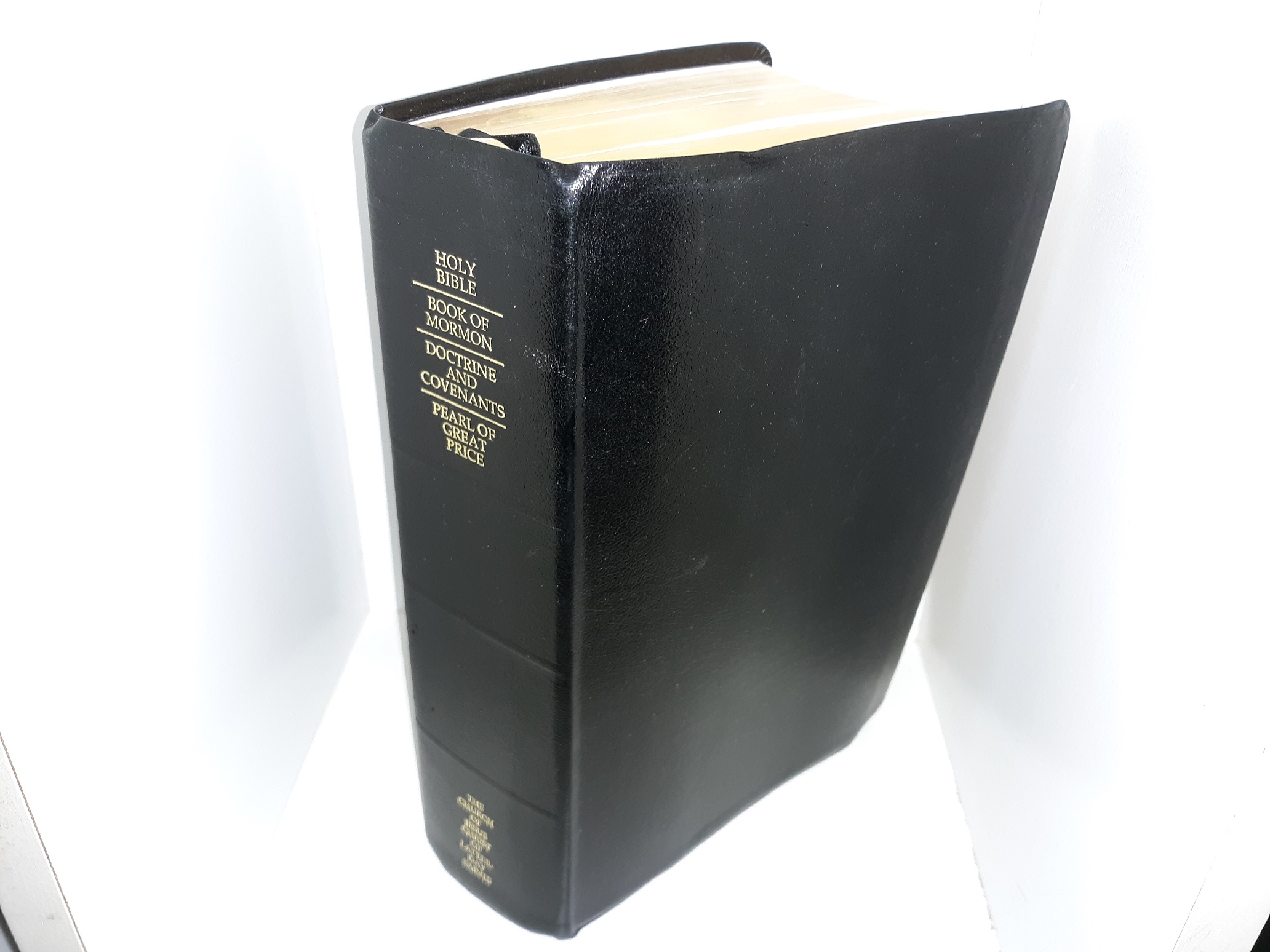 Good condition, very thick, black, leather-bound book. The cover has some scuff marks, and some minor wear at the edges. Some pages have wrinkling. The second flyleaf and title page have writing in pencil and eraser marks. Text and illustrations throughout are clean, clear, and legible.