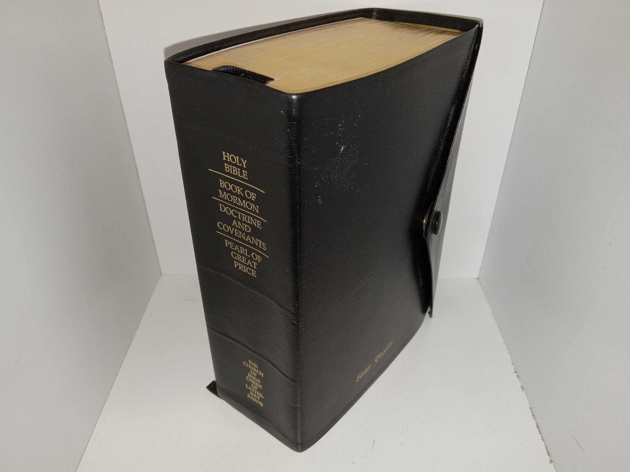 Fair condition, thick, black, leather-bound book. The cover has the name of a previous owner engraved upon the front, and some scuffing. Some pages have creases, or highlighting, marks, underlining, or writing in pen or pencil.