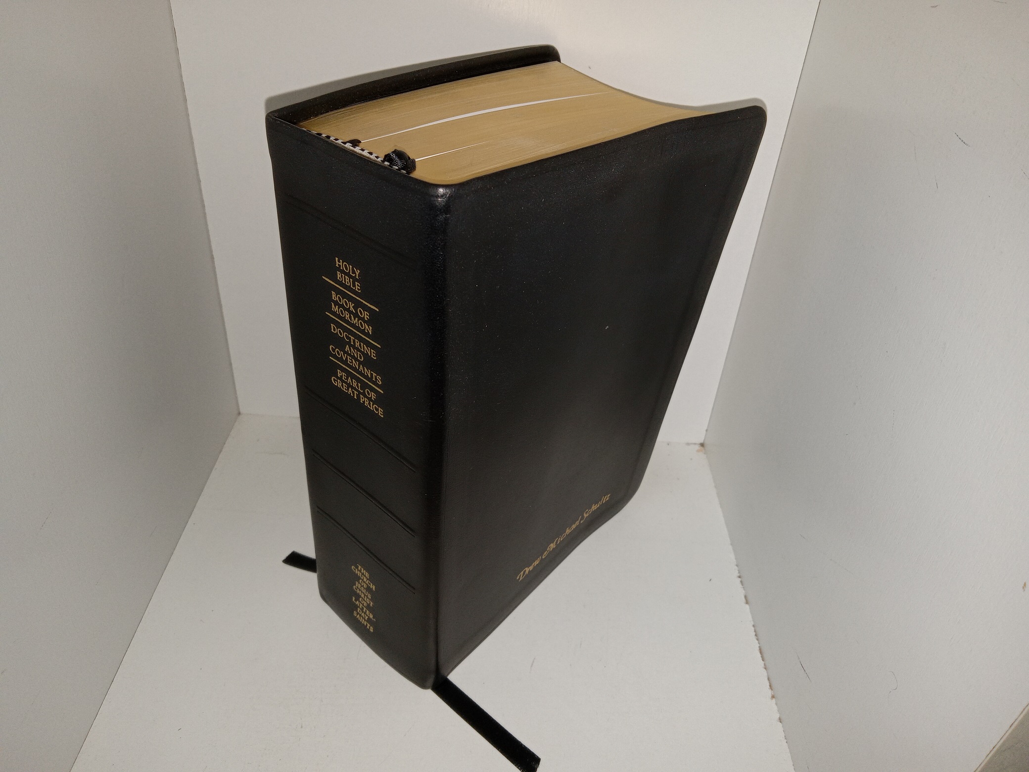 Good condition, very thick, black, leather-bound book. The cover has the name of a previous owner engraved on the front, and some residue. The second flyleaf has writing in pencil. Text and illustrations throughout are clean, clear, and legible.