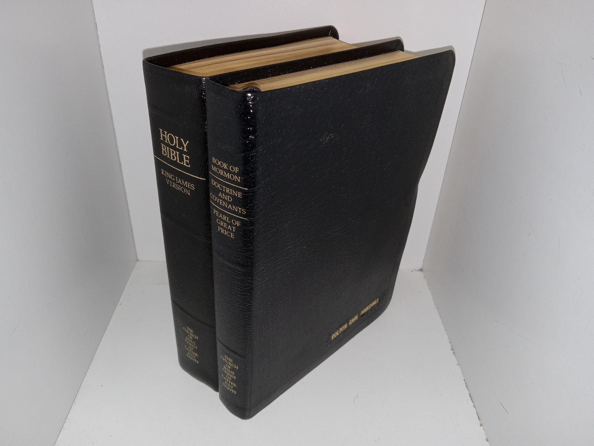 2 good condition, black, vinyl books. The covers have some adhesive residue, the name of a previous owner engraved upon them both (with one of the names being scratches off), and some minor scuffing. The title page of the triple combination has some writing in pencil. Text and illustrations throughout are clean, clear, and legible.
