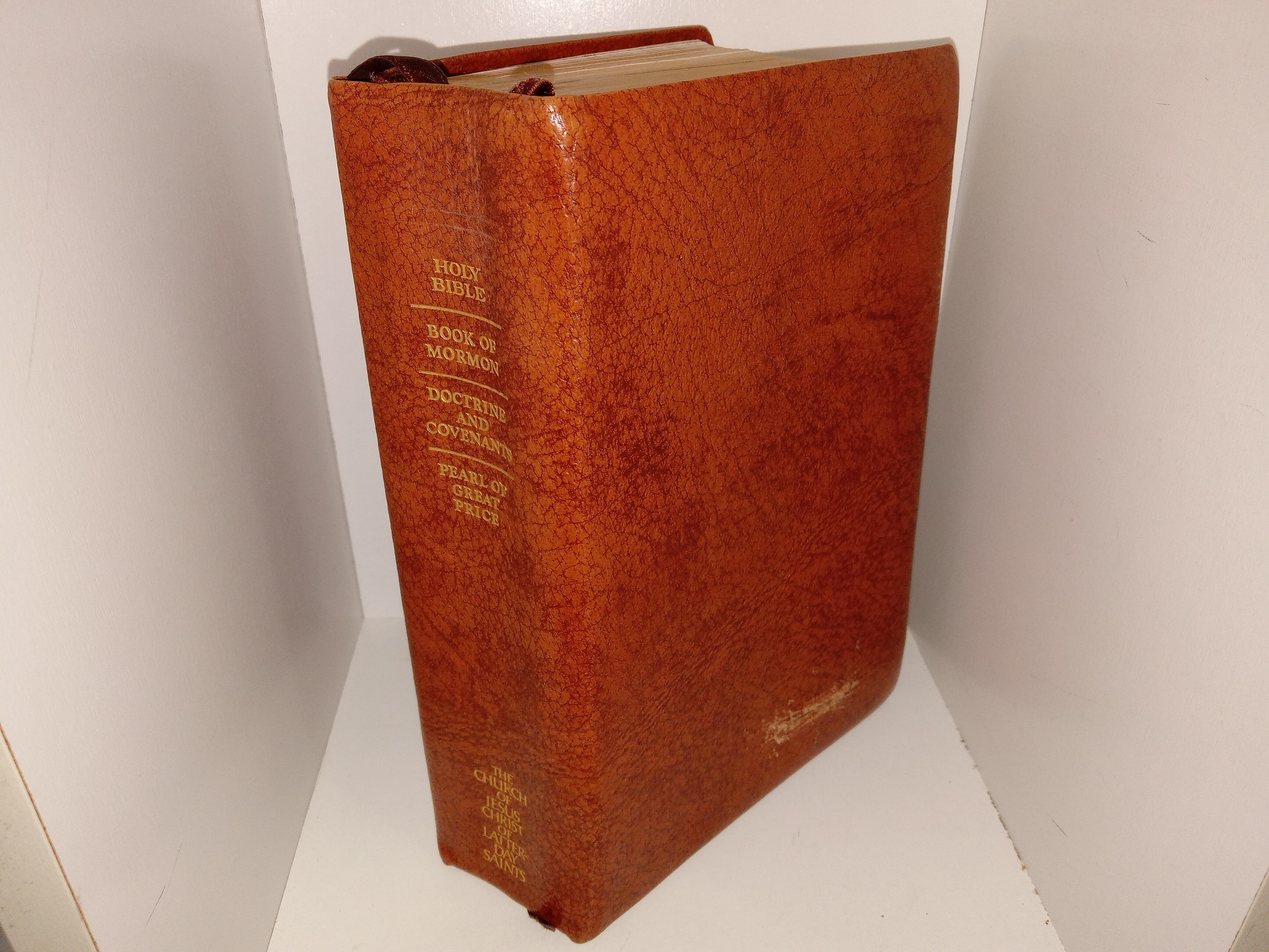Fair condition, thick, brown leather, quadruple combination. The cover has a place where the name of a previous owner was engraved upon it, but was deeply scratched off. The front flyleaf has been torn out. The second flyleaf has a tiny piece torn off. Some pages have wrinkling or highlighting in marker or pencil. The third flyleaf has writing in pencil.