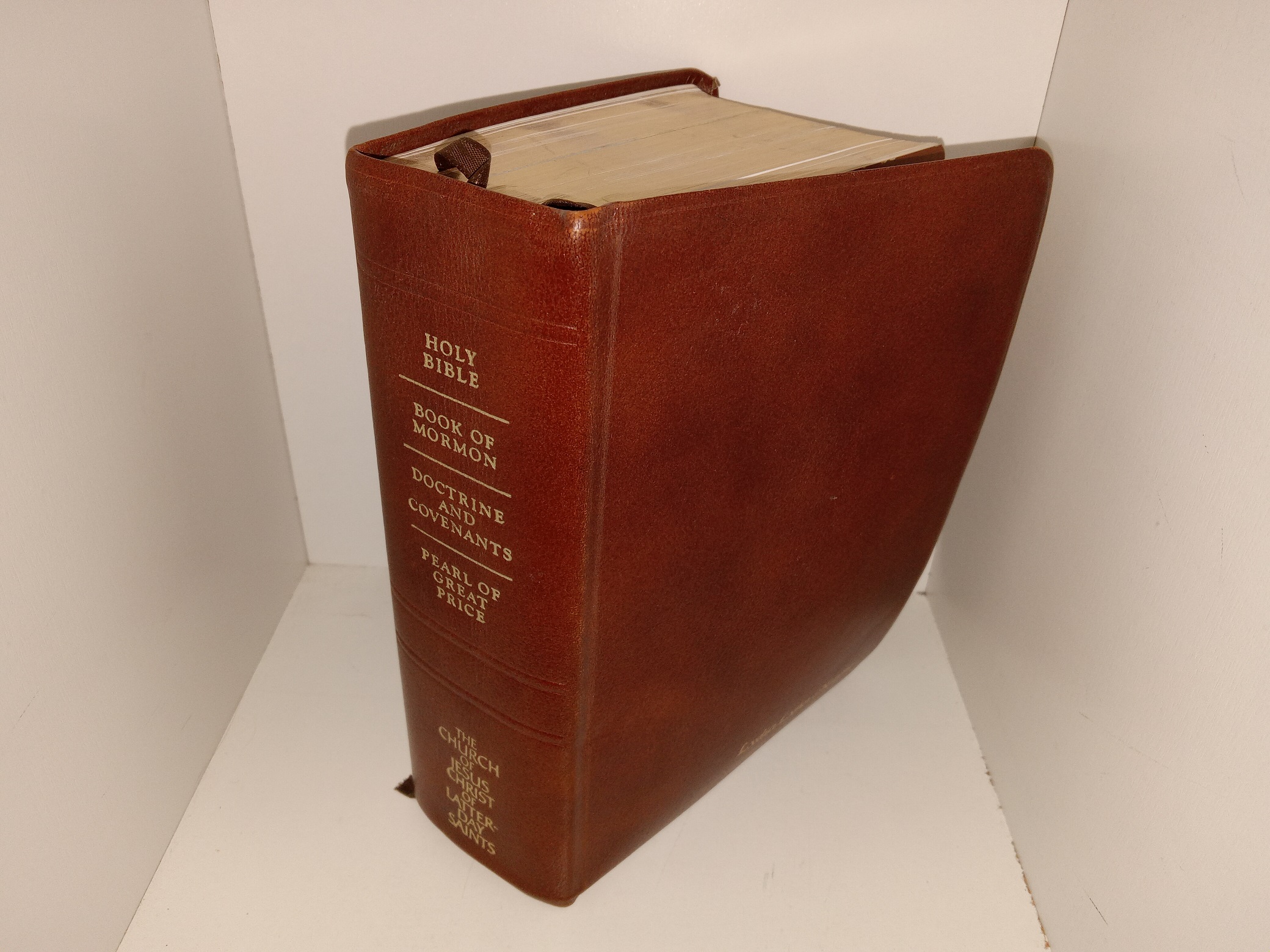 Fair condition, thick, brown, leather-bound book. The cover has some adhesive residue, minor scuffing, and the name of a previous owner engraved upon it. Some pages have stains, scratches, or scuffing on the edges. Some pages have large, see-through stickers, creases, or minor wrinkling. The second flyleaf has writing in pencil.