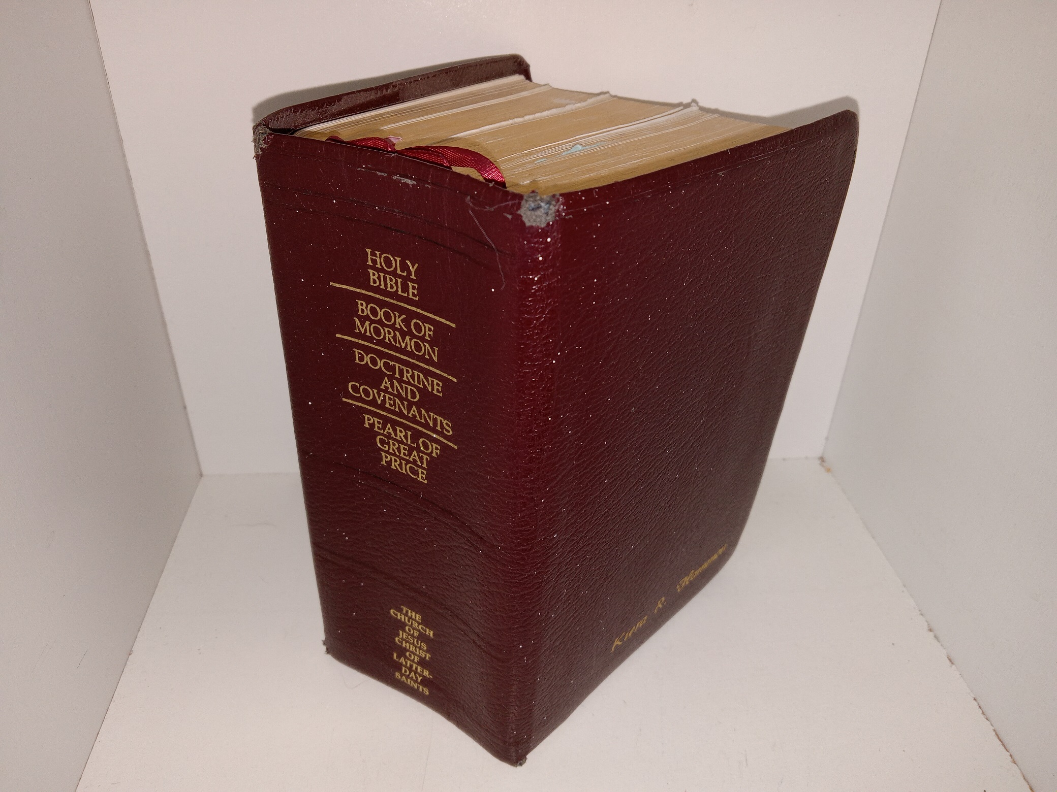 Fair condition, small, very thick, brown vinyl book. The cover has some small tears at the corners, and some wrinkling. The two ribbon bookmarks have frayed tips. The internal binding is loose and have some tears. There was an insert pasted into the middle of the book. Some pages have highlighting in pencil or marker, or notes written in pen. The second flyleaf has writing in pencil.