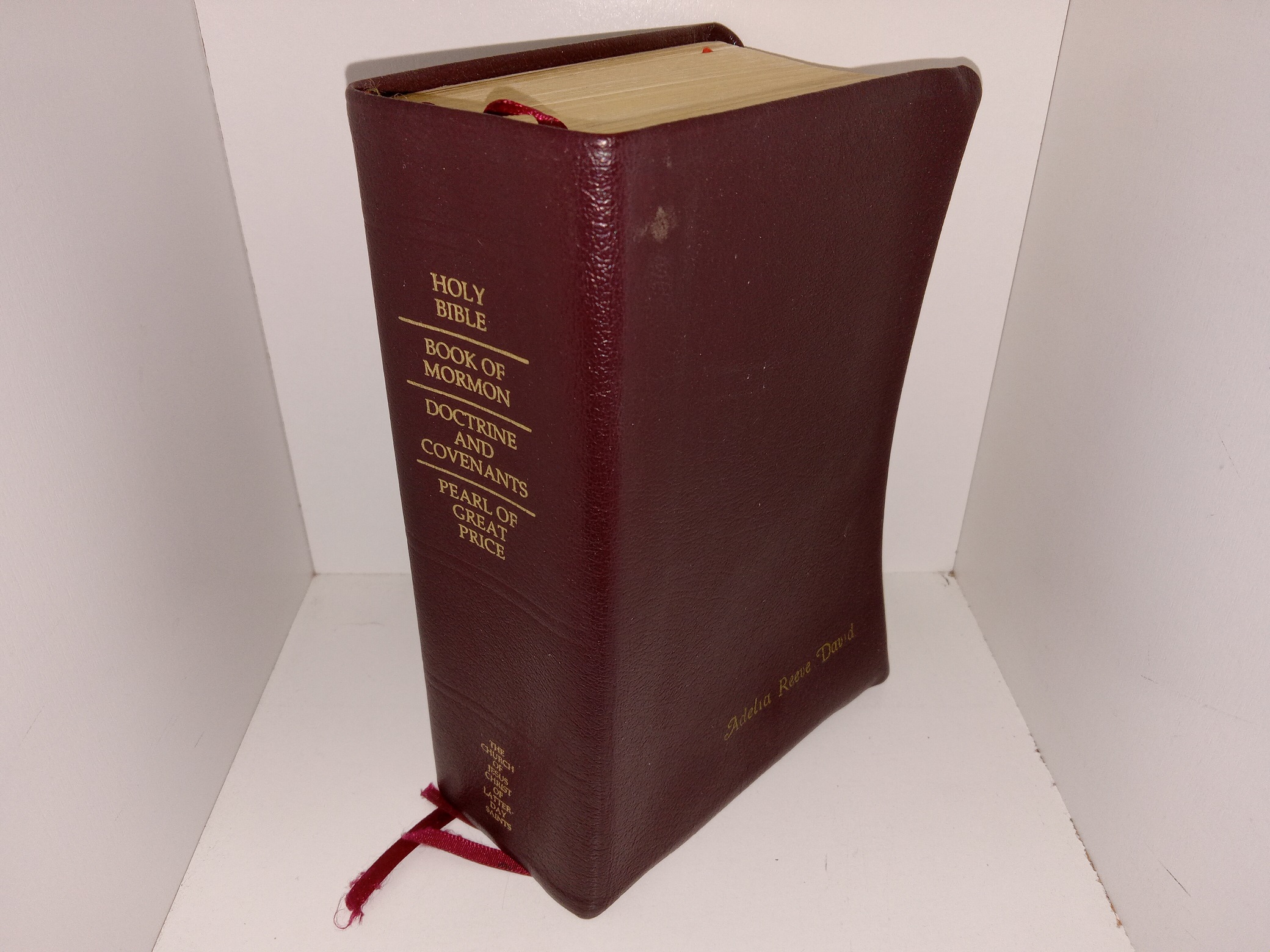 Fair condition, thick, burgundy, leather-bound book. The cover has pale scuff marks, and the name of a previous owner engraved upon it. Some pages have small tears or creases on the edges, wrinkling, marks, highlighting, notes, or underlining written in marker, pen, or pencil.