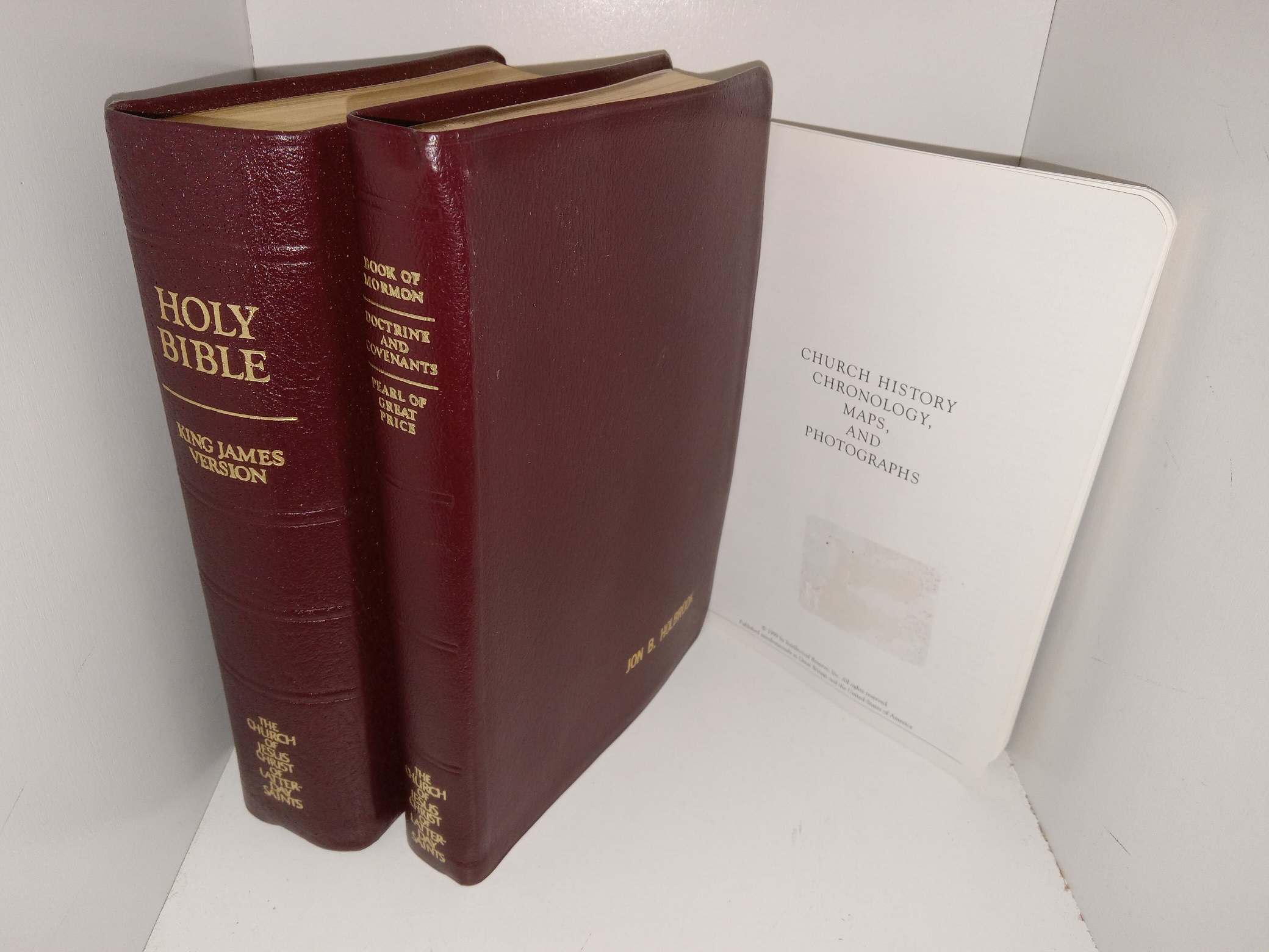 LDS, Burgundy Leather, Triple Combination and Holy Bible w/ Church History Chronology, Maps, and Photographs Pamphlet