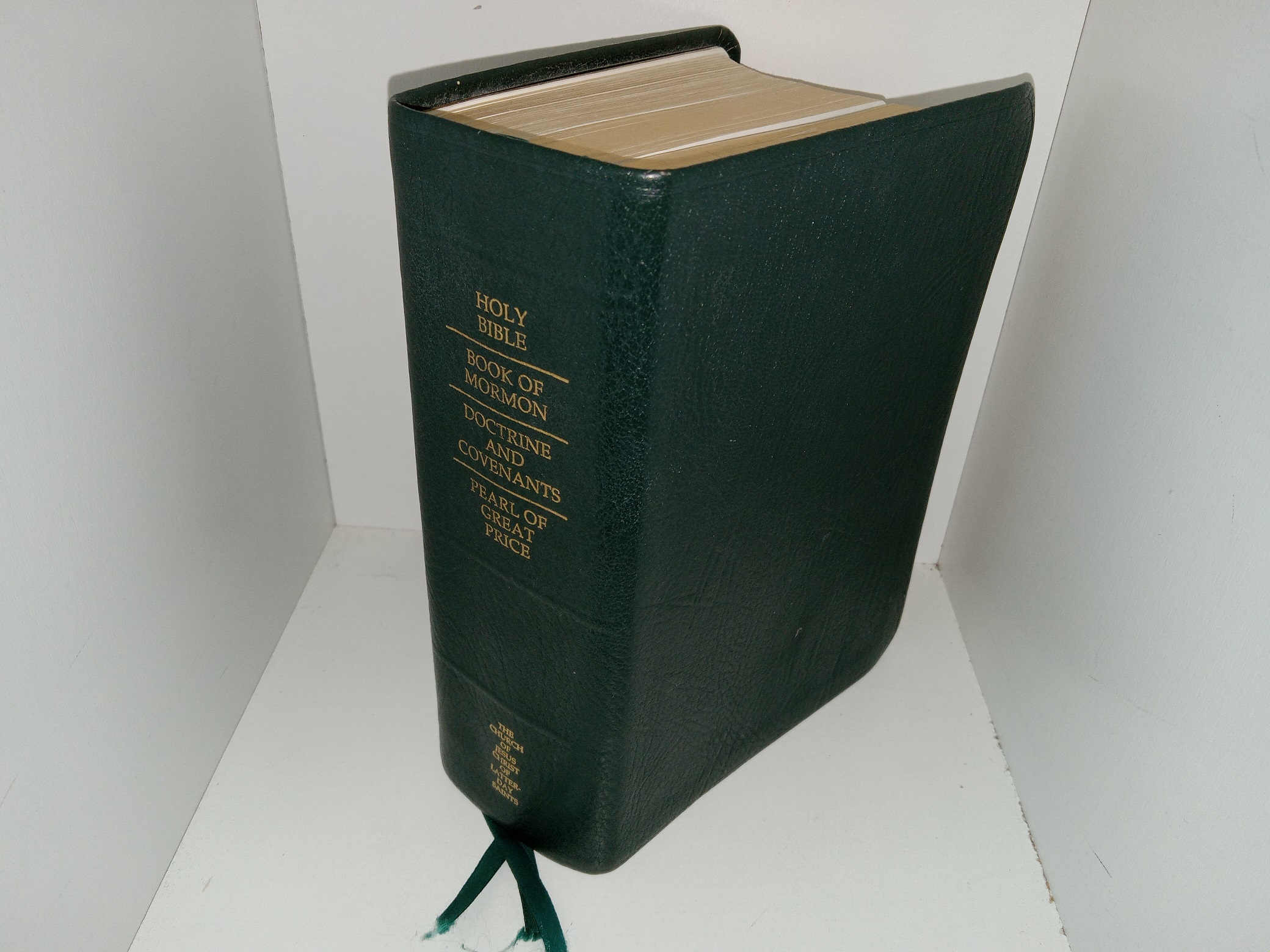 Fair condition, very thick, green, leather-bound book. The cover has some scuffing. The pages have wrinkling, and highlighting, notes, and marks written in pen or pencil.