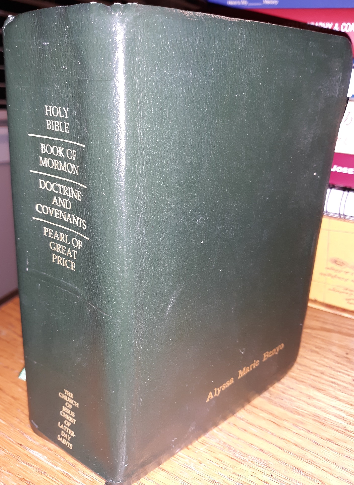 Fair condition, thick, green, leather-bound book. The cover has scuff marks, scratches, and a name embossed on the front cover. The internal binding is torn, and a little loose. Several pages are wrinkled or dogeared. There are notes, underlining, and highlighting throughout the text in pencil, pen, and marker…………………….v702 Bx203
