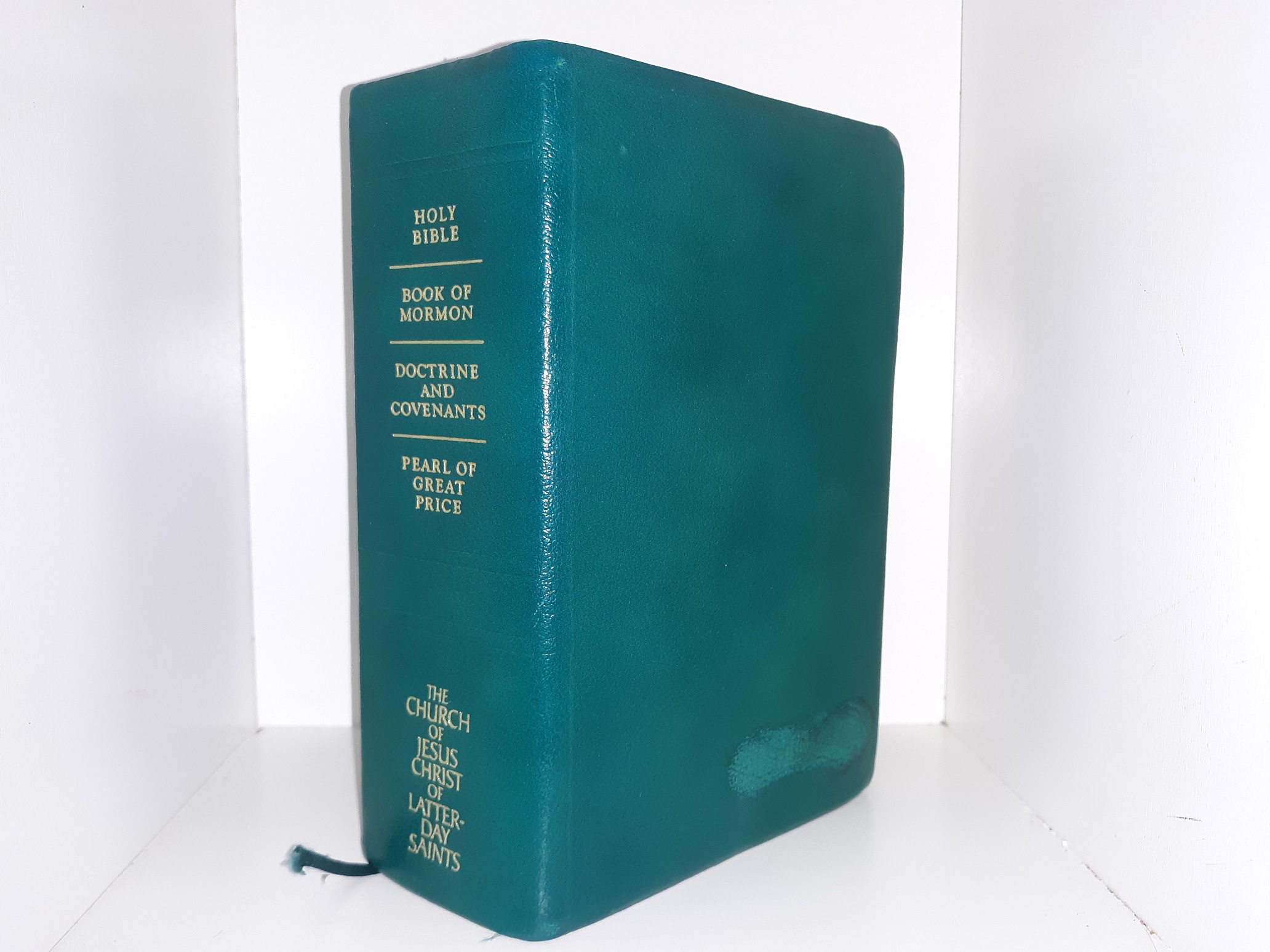 Fair condition, thick, teal, leather-bound book. The cover has a worn patch where the name of a previous owner was engraved upon it, and some marker marks. The first and second flyleaf are partly stuck together. The second flyleaf has an old sticker, and some pencil writing. There are highlighting and marks throughout the text in pencil.