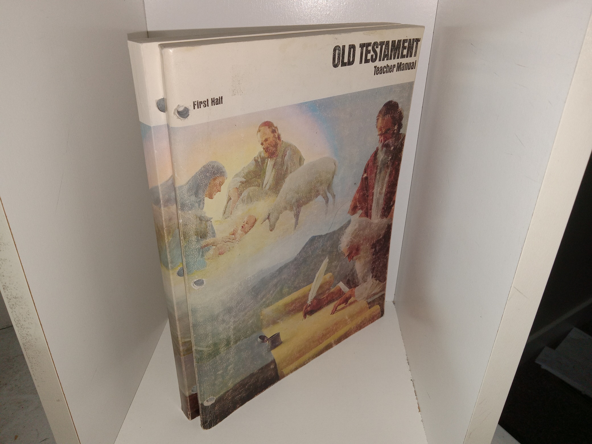 2 fair condition, large softcovers with 3 holes punched next to the binding. The bindings are slightly crooked. The covers have wrinkling, creases, scuffing, small tears, stains, and some adhesive residue. Some pages have minor stains on the edges or in the margins, or small tears along the edges of the holes punched next to the bindings. The title pages have writing in pen and pencil. Text and illustrations throughout are clear and legible.