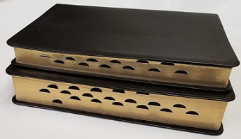Name inked in red ink inside front cover of each; otherwise just like new, clean throughout; good quality black leather bindings! Gold leafed page edges; very nice!