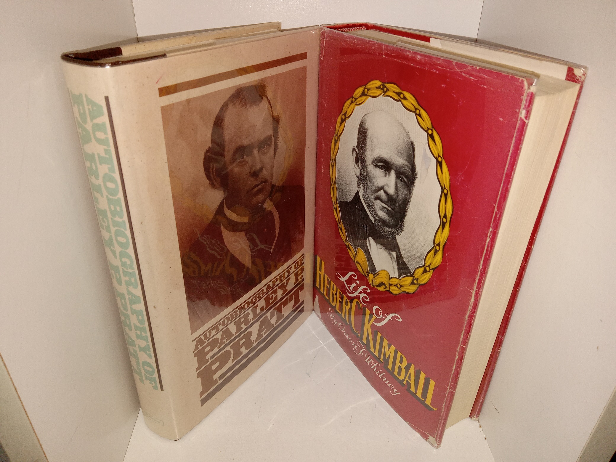 2 fair-good condition hardcovers with dust jackets and mylar covers. Life of Heber C. Kimball has a dust jacket with tears, pieces torn off, scuffing, creases, and fading, the internal binding is torn and slightly loose, some pages have yellowing, ink stamps on the inside covers and flyleaves, small stains on the edges, and the front flyleaf has writing in pencil and eraser marks. Autobiography of Parley P. Pratt has a dust jacket with some small red marks, and the front flyleaf also has writing in pencil and eraser marks. Text and illustrations throughout are clean, clear, and legible.