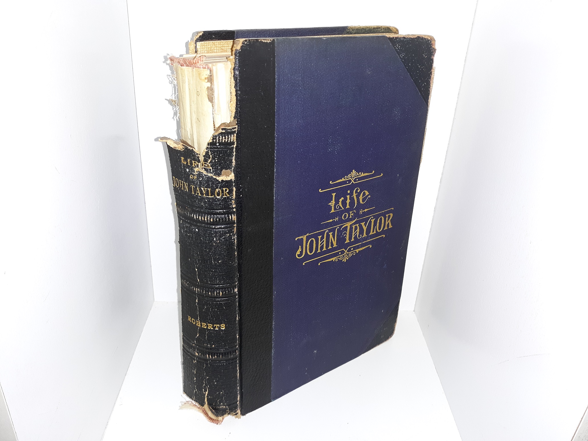 Fair condition, dark blue hardcover with no dust jacket. The covers have been detached from the pages and spine. The covers have large pieces torn off, additional tears, scuffing, fading, and fraying. The binding has some fraying, tearing, and is loose. Some pages are detached, or partially detached from the binding. Some pages also have dark scuff marks. The first two flyleaves have tears, writing in pencil, and eraser marks. The title page has some ink bleeding from the illustration on the page before. Text and illustrations throughout are clear and legible.