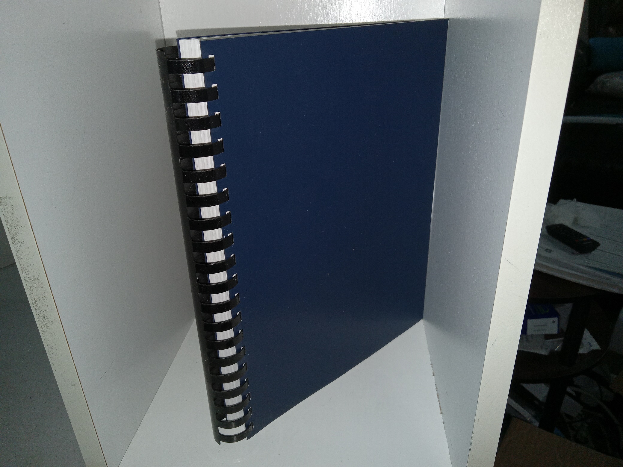 Good condition, large, dark blue softcover with no title printed on the covers, and with a black comb binding. The first page has writing in pencil, and eraser marks. Text throughout is clean and legible.