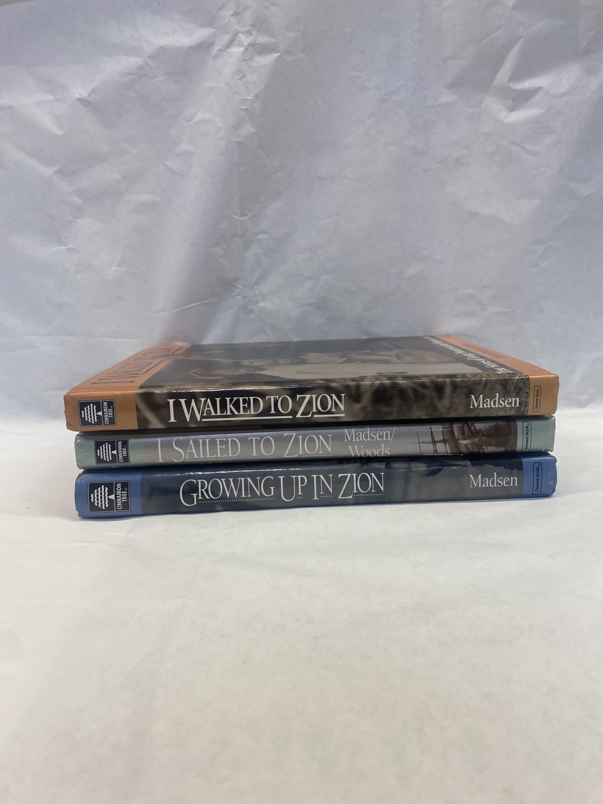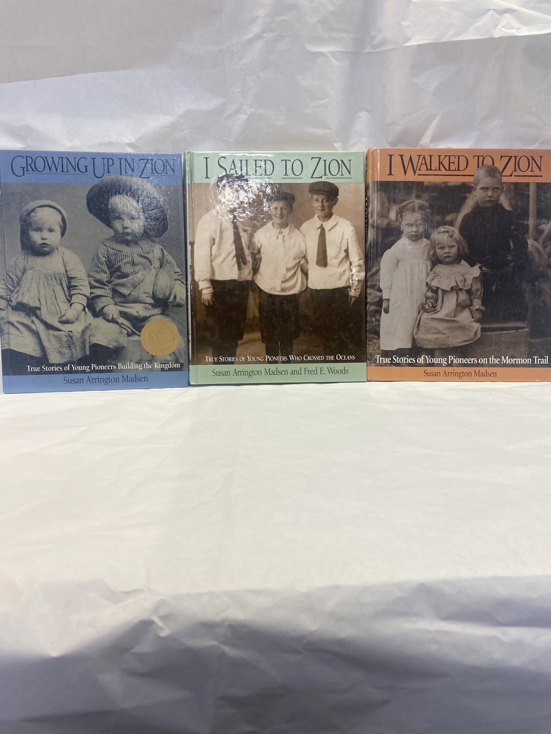 True Stories of Young Pioneers 3 Volume Set by Susan Arrington Madsen with Fred E. Woods for the I Sailed to Zion volume. Hardcover, includes; I Walked to Zion, True Stories of Young Pioneers on the Mormon Trail (1994), Growing Up in Zion, True Stories of Young Pioneers Building the Kingdom (1996), and I Sailed to Zion, True Stories of Young Pioneers Who Crossed the Ocean (2000).
