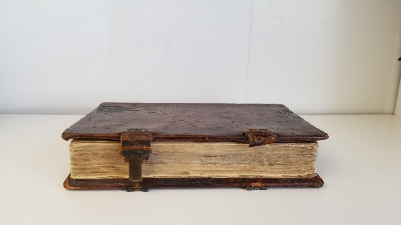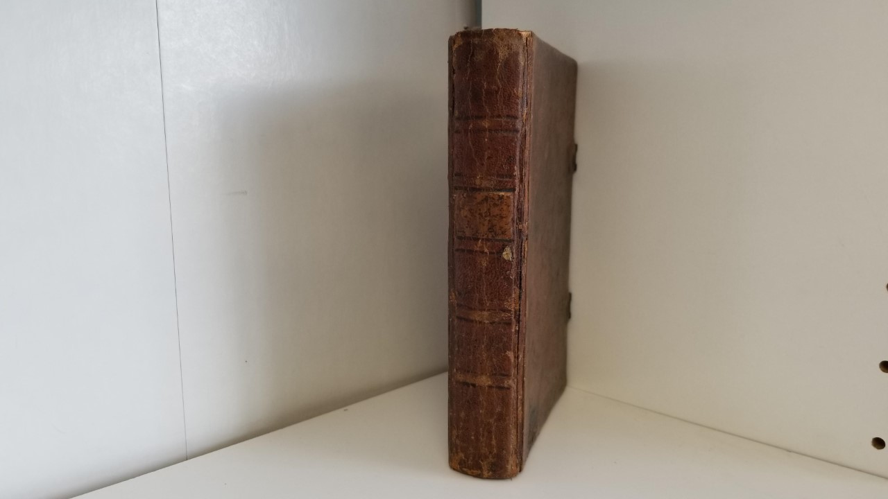 Brown leather binding; 1852. First edition in Welsh. Has little leather snaps that go across to hold pages together (one is broken off but present)