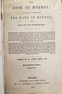 Book of Mormon. Liverpool, Published for Orson Pratt, by S. W. Richards, 1854. 563 pages. Black leather; spine has been repaired. Title page damaged at upper right corner. Overall quite good.