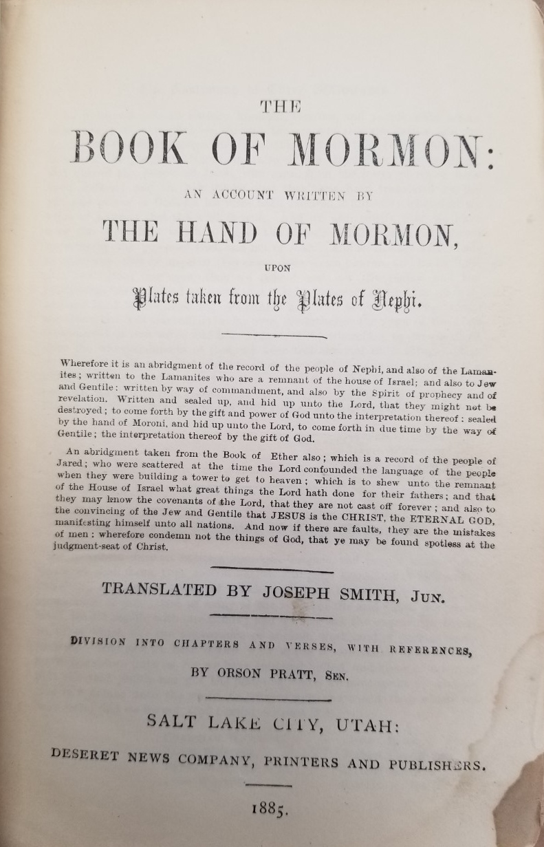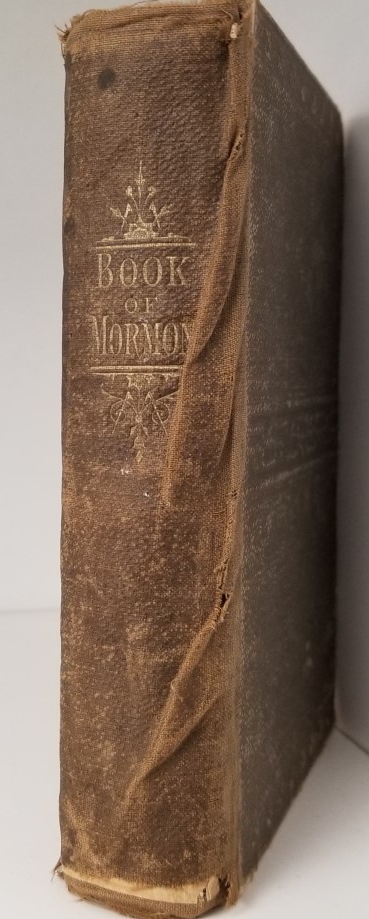 1885 Salt Lake City Edition; cloth binding is quite worn; wrinkled on the spine, as shown in one of our pictures. Binding starting to loosen a bit but still holding; detached along the front hinge inside the binding. Title page and some others have staining at the bottom corner, but it stops showing on the corners by the time you get back past about page 10.