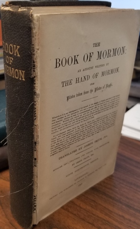 This edition of the Book of Mormon is actually quite scarce; but this copy is missing the front board; the text block is great. The spine and back board have some wear but not horrible. Clean text throughout.