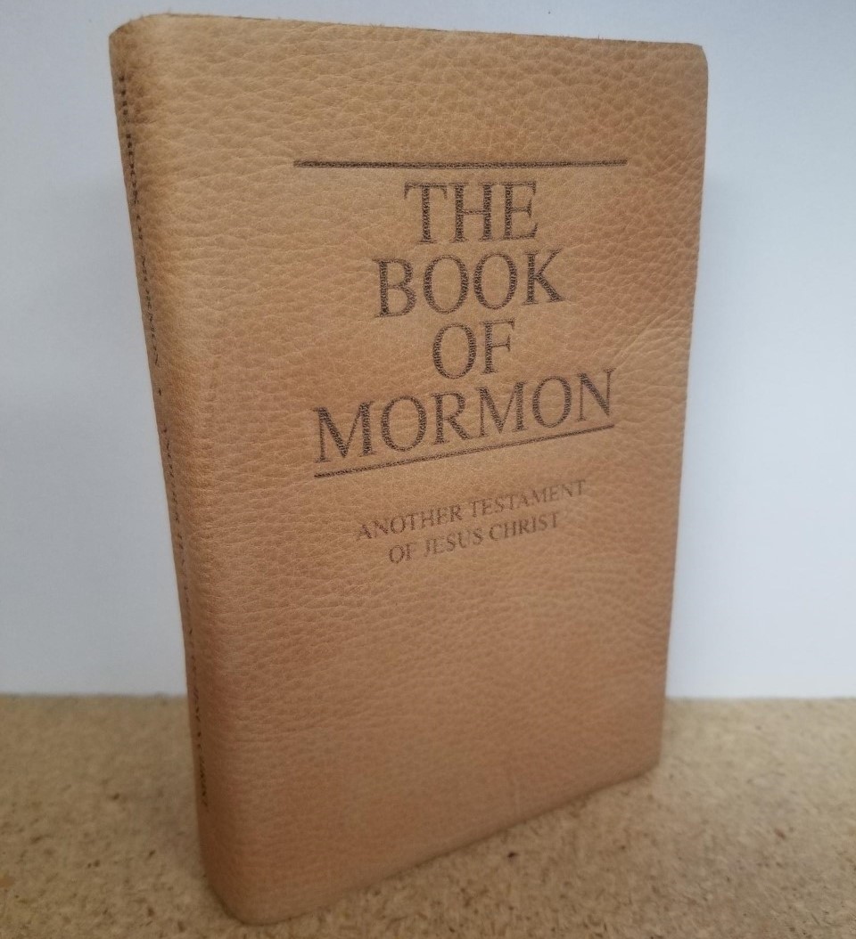 This cute little Book of Mormon was most likely one of the pocket editions bound in blue vinyl, but was rebound in suede-like leather for a Youth Conference. Probably not many were made. Very good condition. We’ve pictured the front and the back.