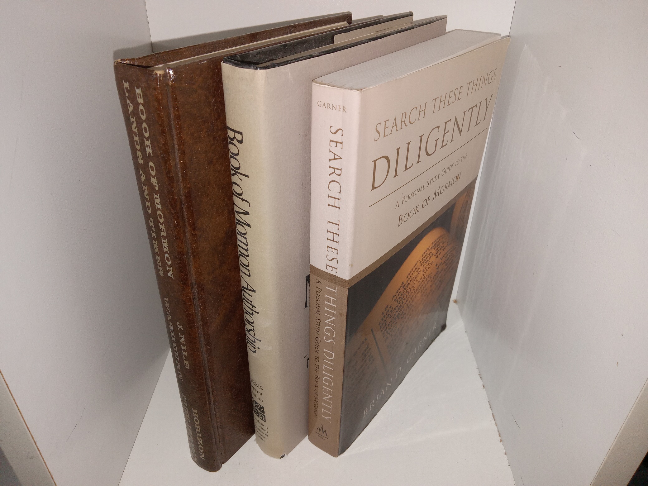 3 fair-good condition books (1 hardcover with no dust jacket, 1 hardcover with a dust jacket, and 1 softcover). Book of Mormon Lands and Times has some minor scuffing on the cover; The front flyleaf has a large piece torn off next to the binding, eraser marks, and writing in pencil; and some pages may have tiny stains or residue in the margins. Book of Mormon Authorship: New Light on Ancient Origins has small pieces torn off, small tears, stains, dark scuff marks, and discoloration on the dust jacket; some pages have dark marks on the edges, or highlighting written in marker in the text. Search These Things Diligently: A Personal Study Guide to the Book of Mormon has scuffing, wrinkling, creases, residue and stains on the cover; some pages have stains on the edges or creased corners; and the title page has writing in pencil and ersaer marks.