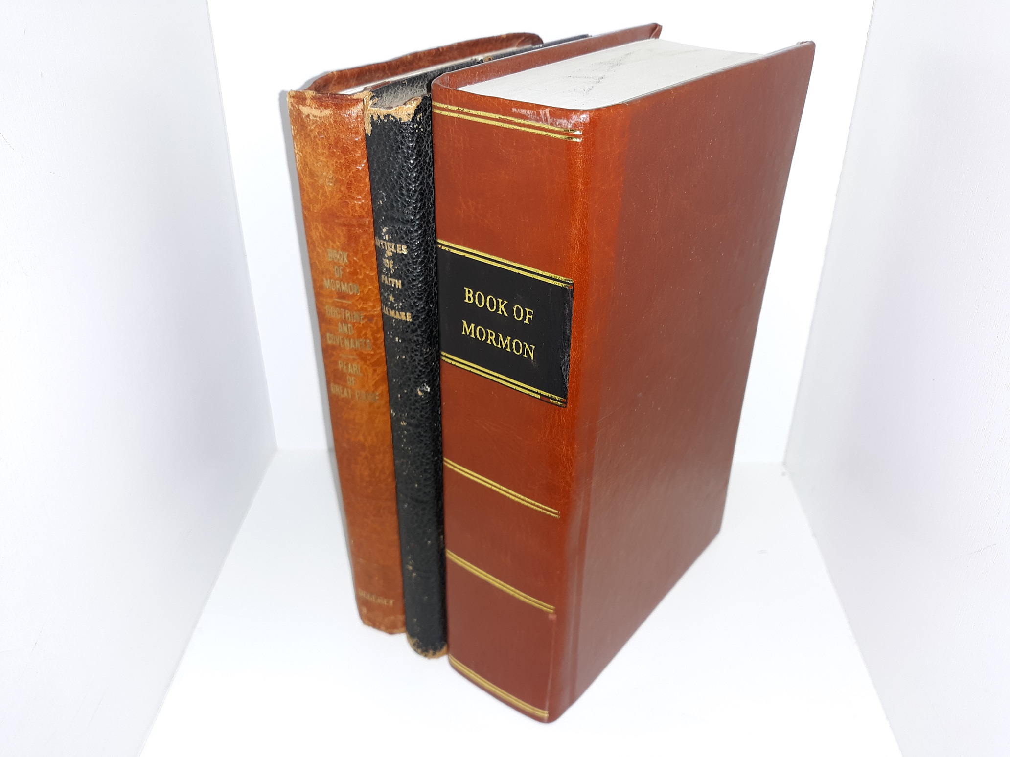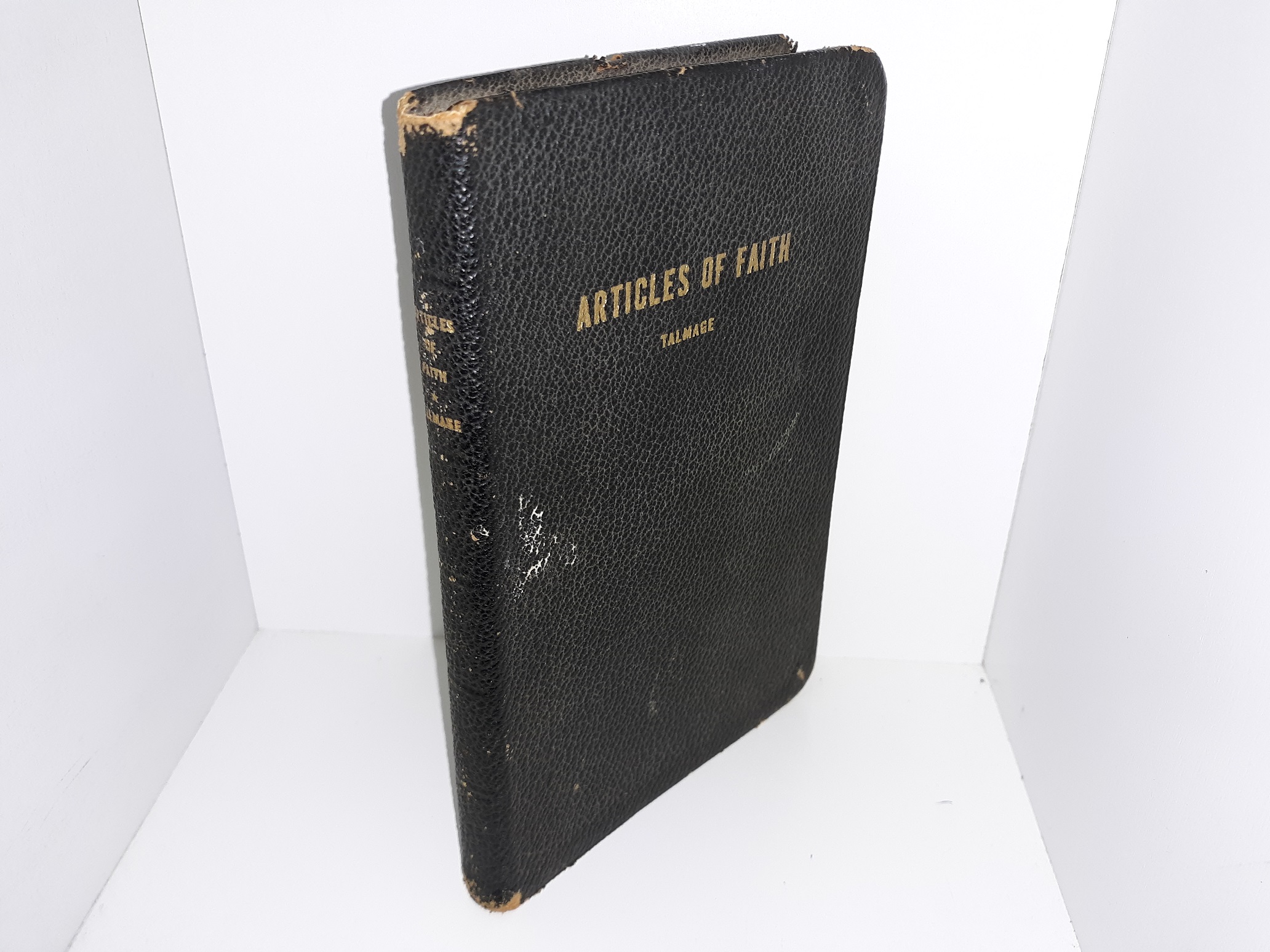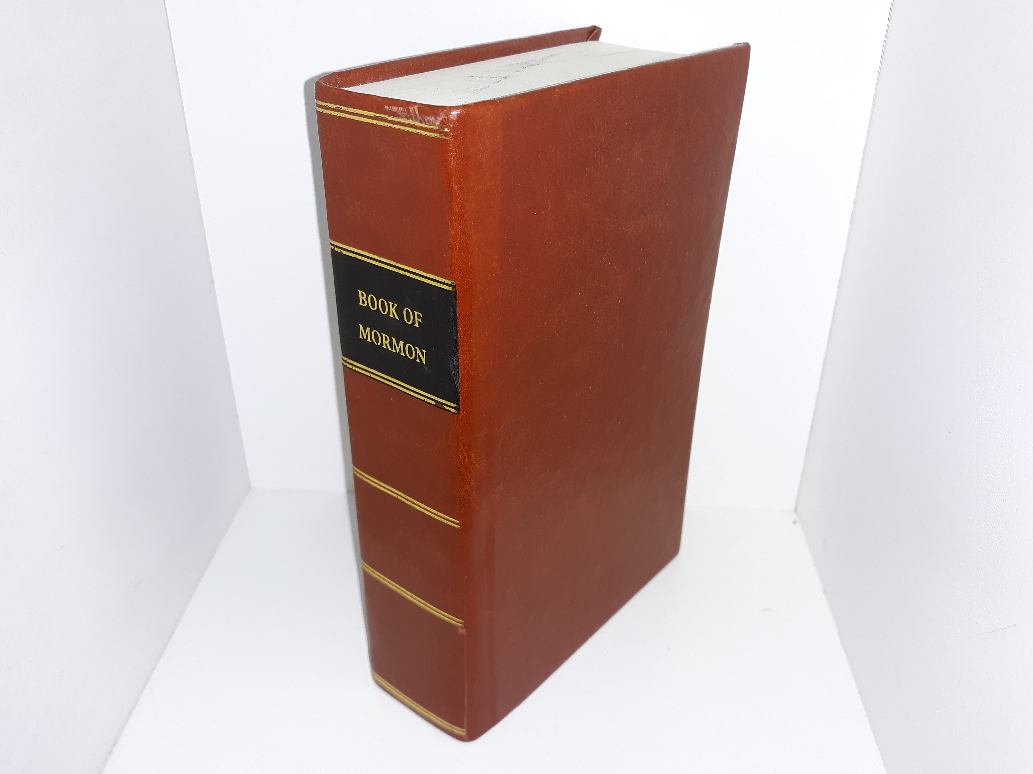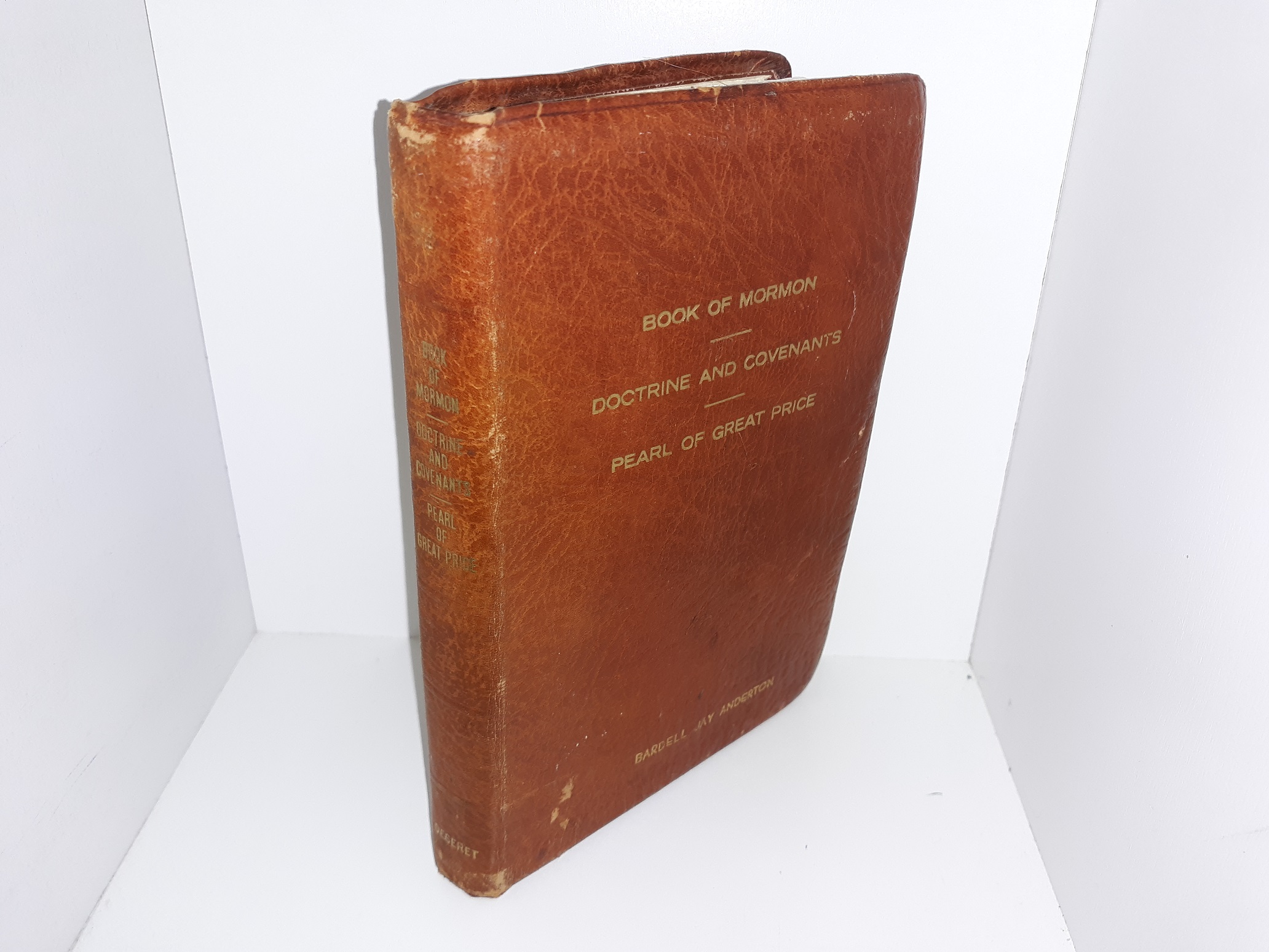 Fair condition, thick, brown, leather-bound book. The cover has a couple minor scuff marks. The pages have slight water damage, including some minor stains on the edges. The front flyleaf has writing in pencil. Text throughout is clear and legible.