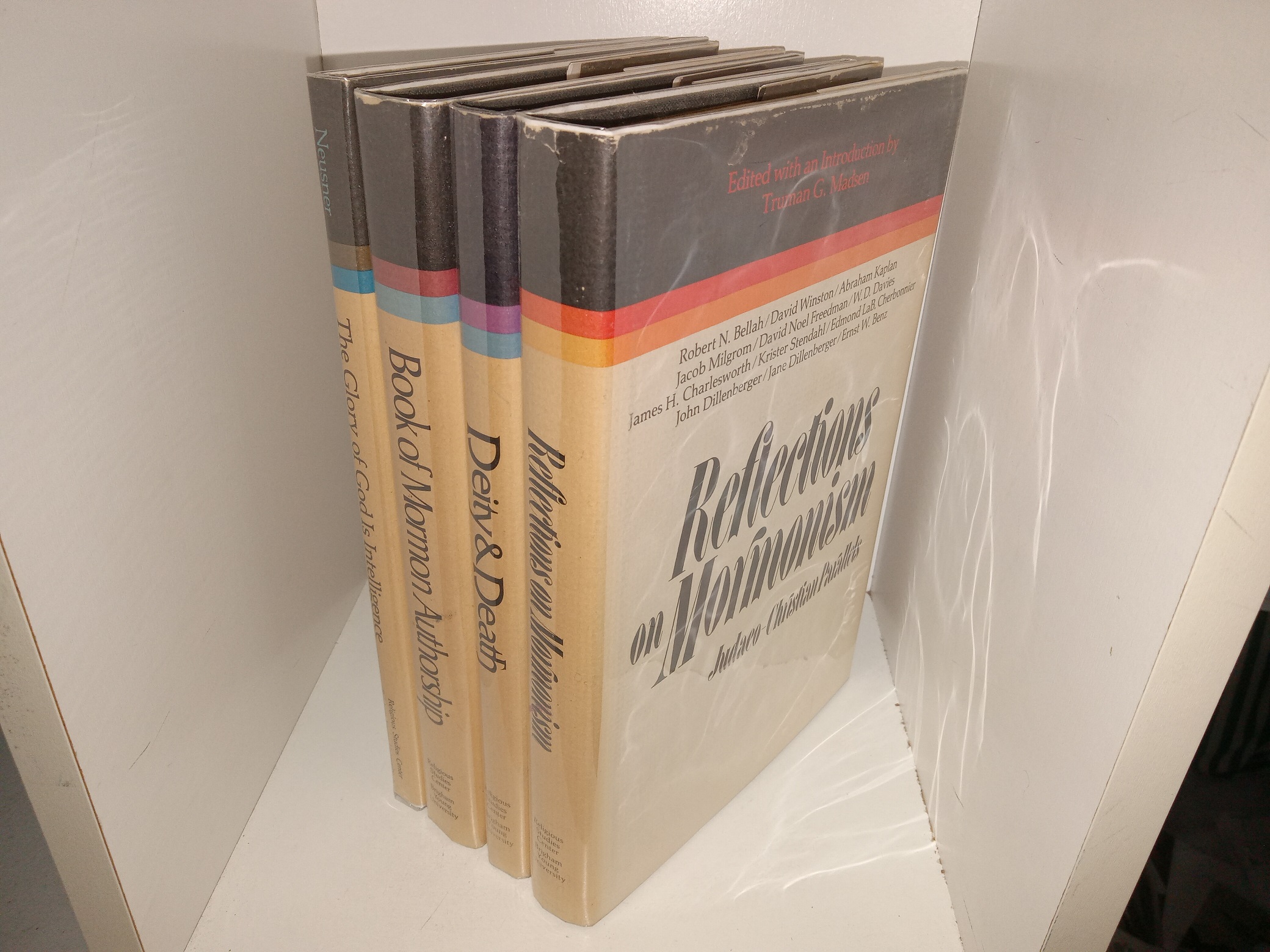 4 fair-good condition hardcovers with dust jackets and mylar covers. The mylar covers may have some residue and scuffing. The dust jackets have stains and scuffing. The front flyleaf of Reflections on Mormonism: Judaeo-Christian Parallels has writing in pencil and eraser marks. Text throughout each books is clean, clear, and legible. Some pages have creases.