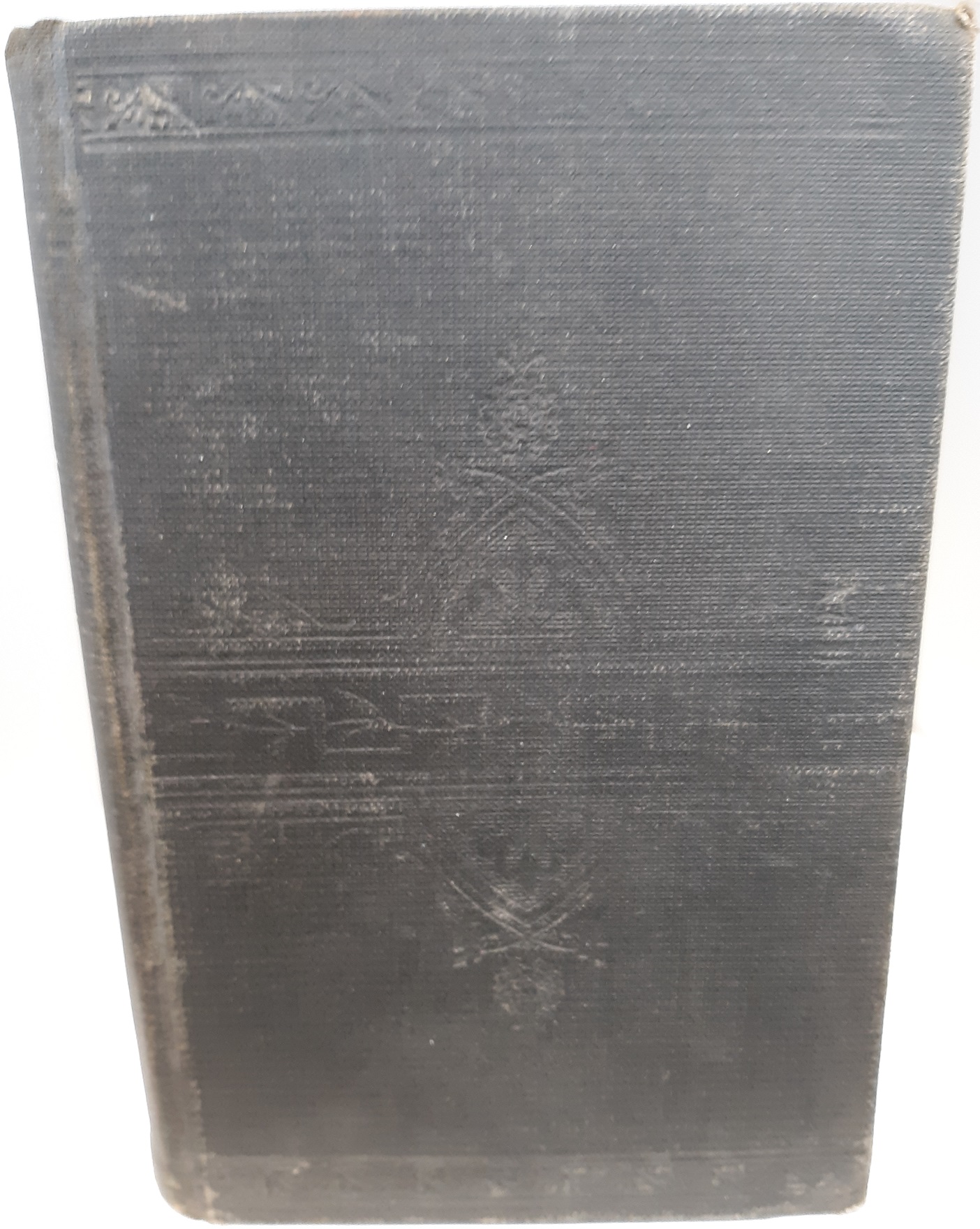 Fair condition, black hardcover with no dust jacket. The cover has scuff marks, scratches, some minor stains, discoloration, the edges and corners have some fraying and are bent. The binding is loose. The edges of some pages are stained. the front inside cover has an inscription written in dark blue ink. The flyleaf has some stains, and some blue and gray pencil and eraser marks. A few pages have stains that do not interfere with the legibility of the text. Some pages have tears against the binding, but are still attached to the binding.