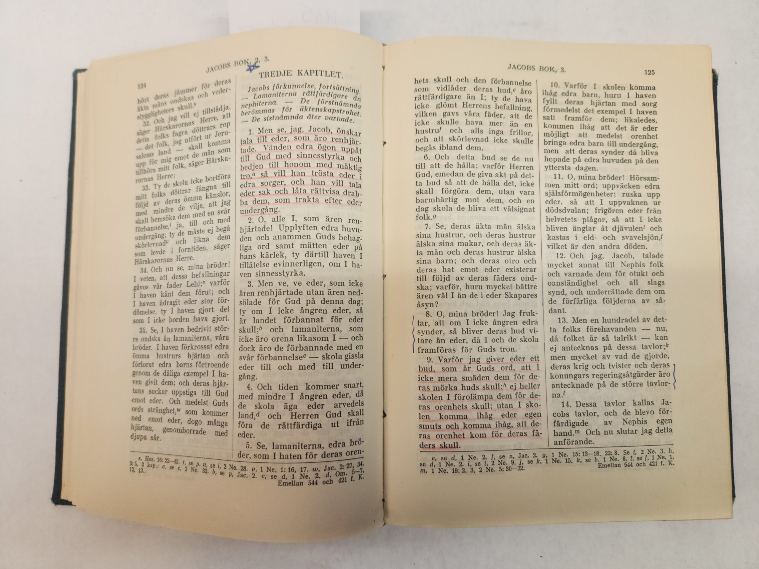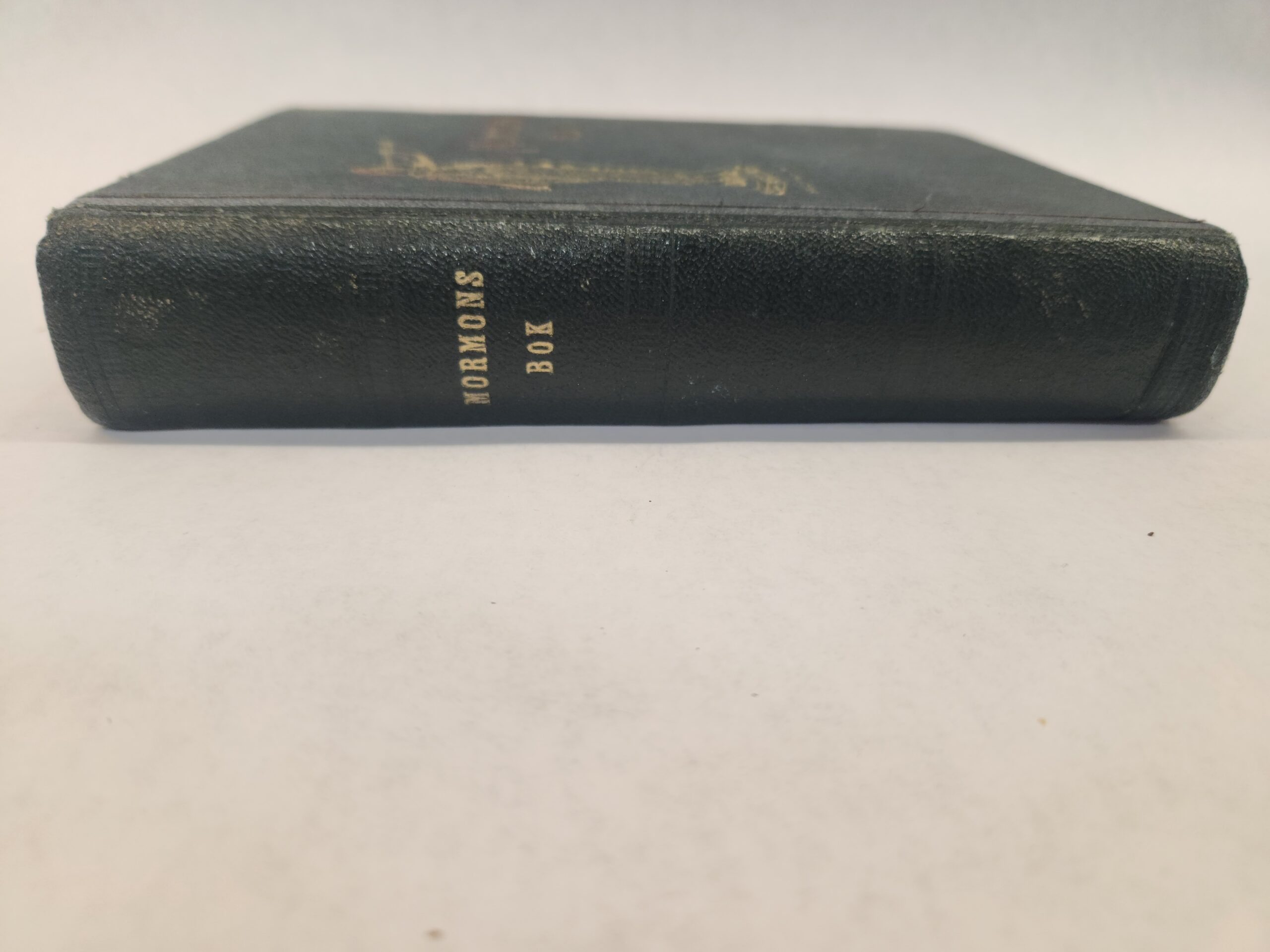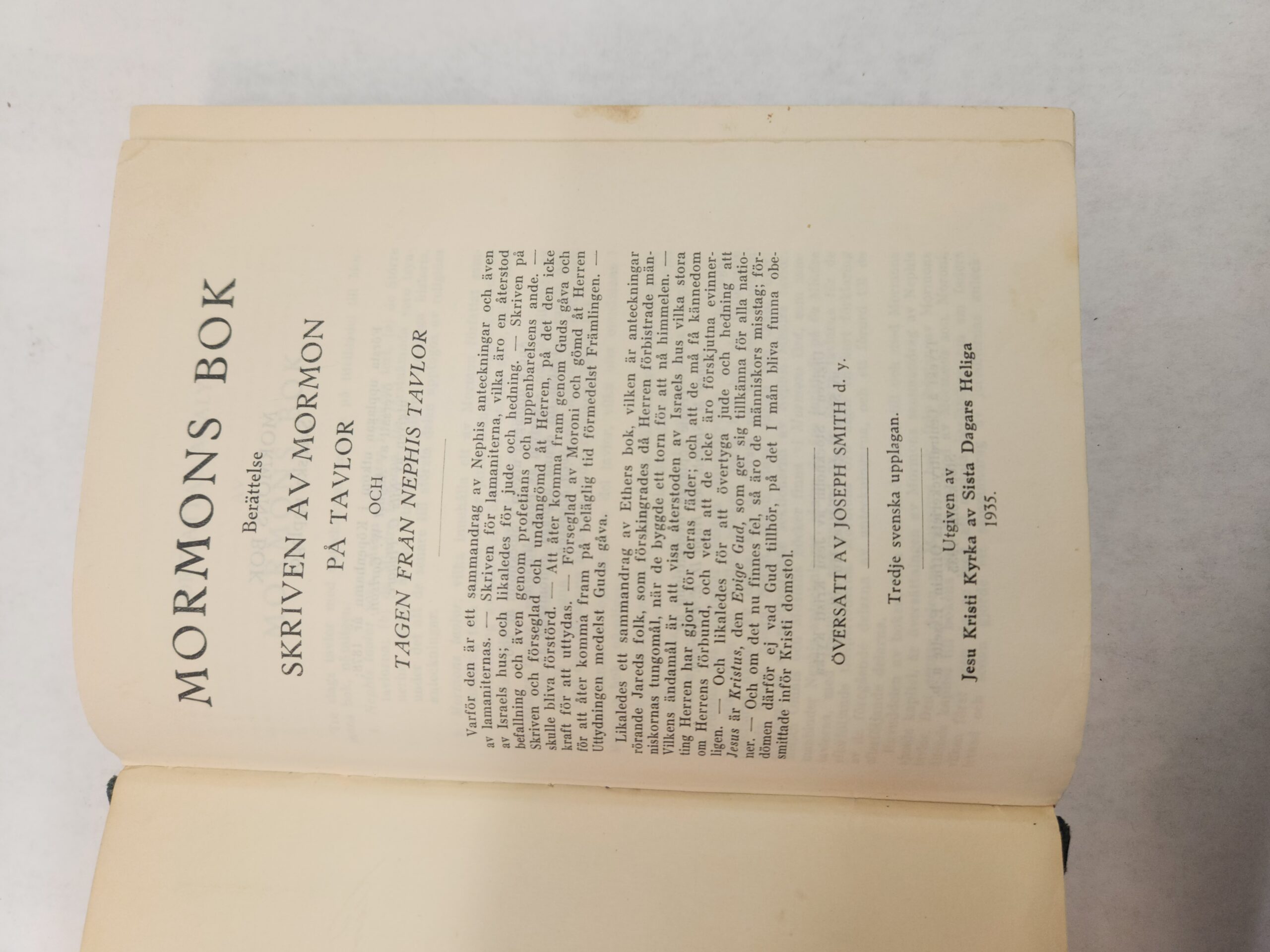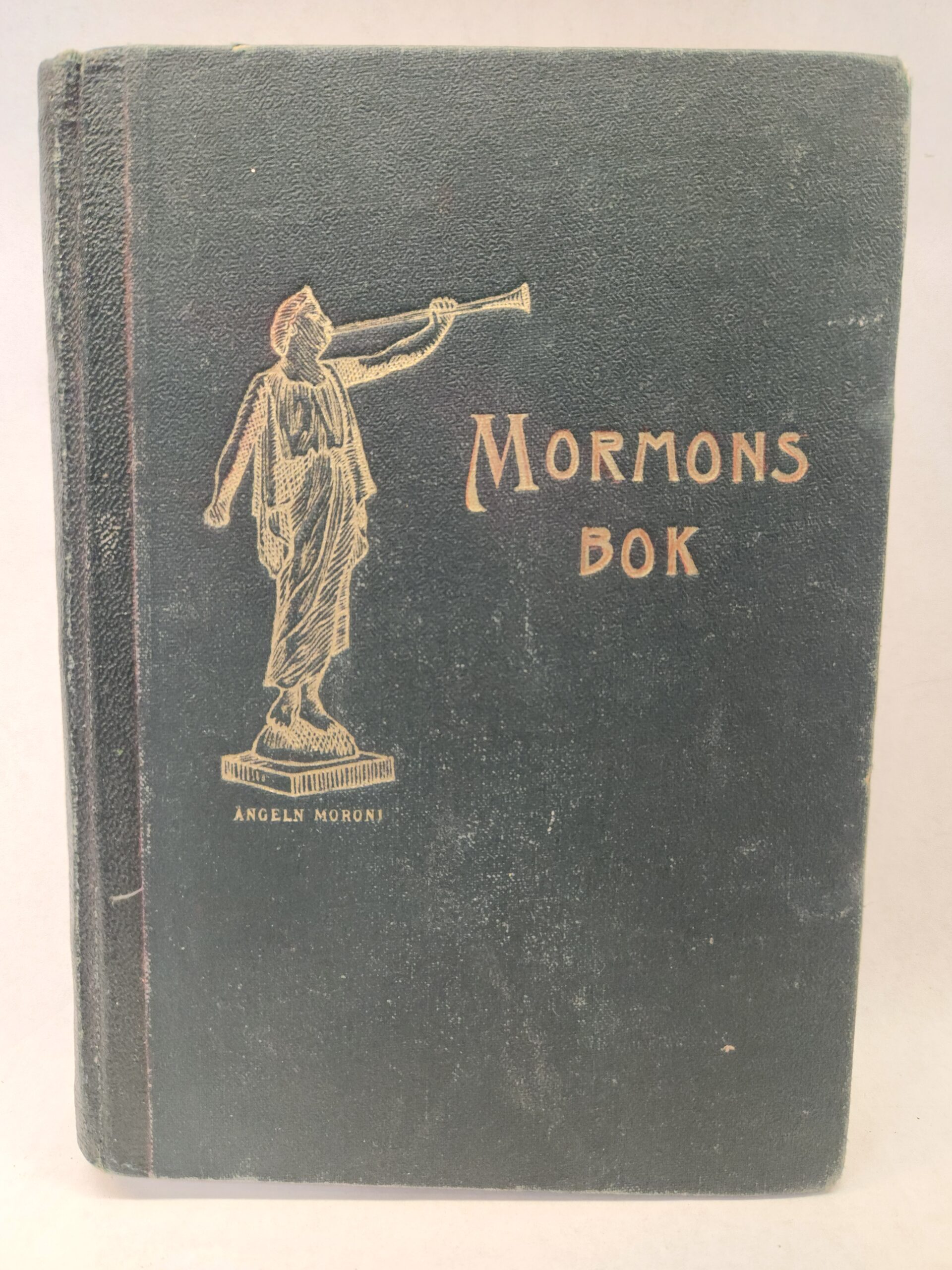 Book of Mormon (1935, Hardcover, green faux leather, Book of Mormon Swedish edition) There is some underlining in red and annotations in pen throughout the book. Also some writing on inside of front cover (see pic). Binding is holding but wearing (see pic of binding to see a little ribbing). Corner and edges show shelf wear. Cover show some wear with scuff/dent/light scratch marks.