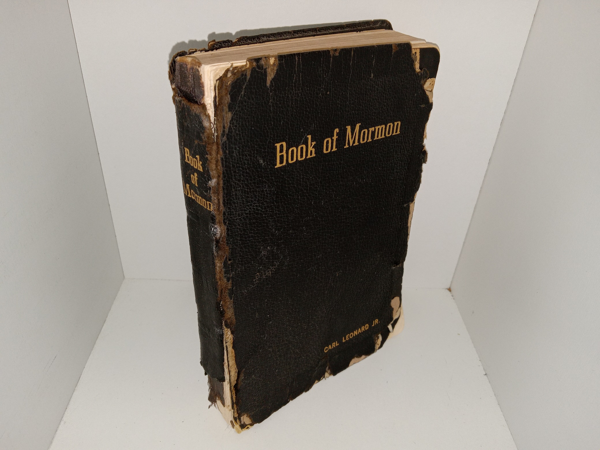 Fair condition, black, leather-bound book. The front cover and front flyleaf are detached from the binding. The covers and spine have large pieces torn off, tears, and the name of a previous owner engraved on it. Some pages are detached from the binding, or have tears or pieces torn off (with the second flyleaf missing half of itself. The following page has writing in pencil. Some pages have notes or marks written in pen.