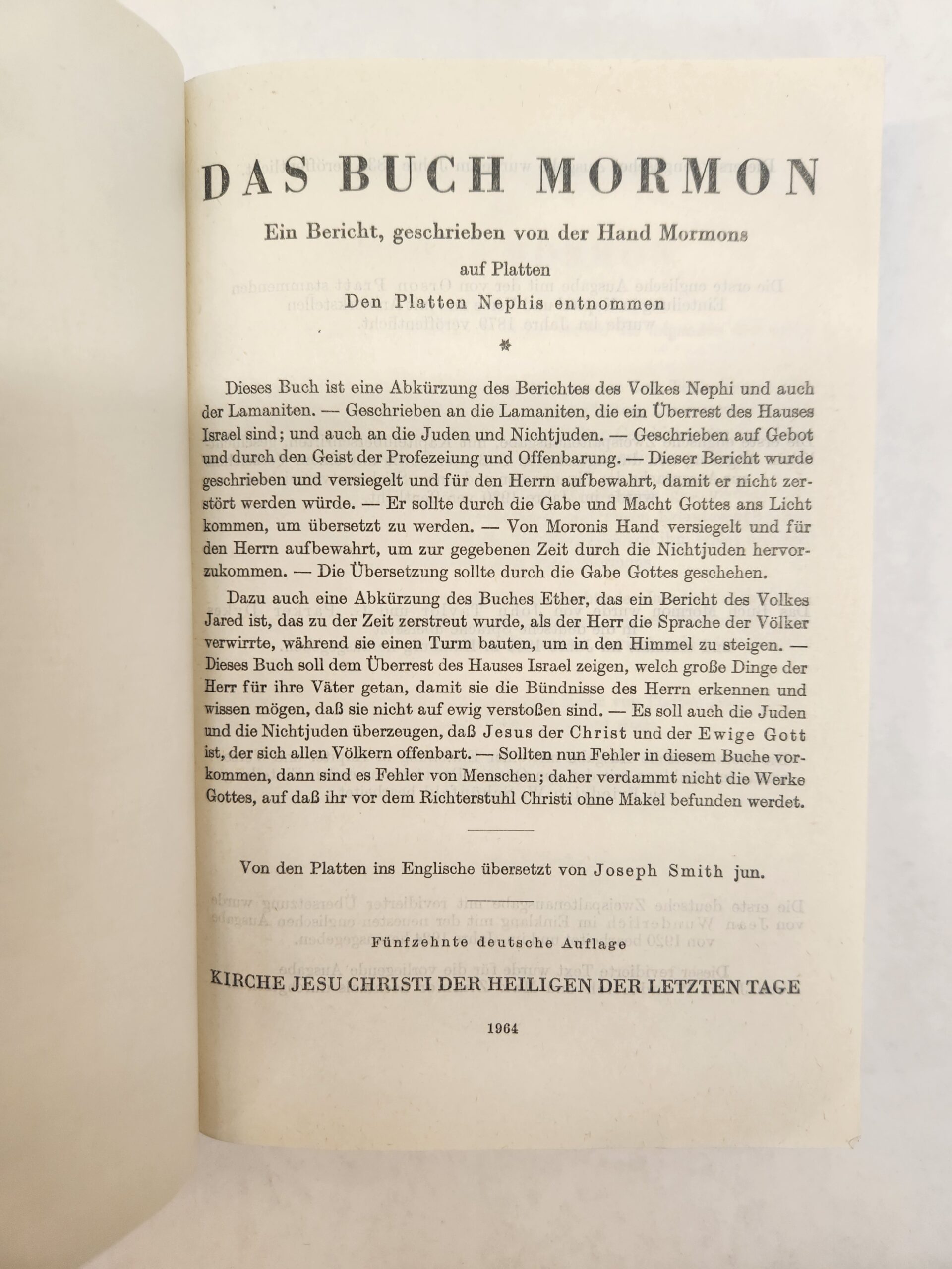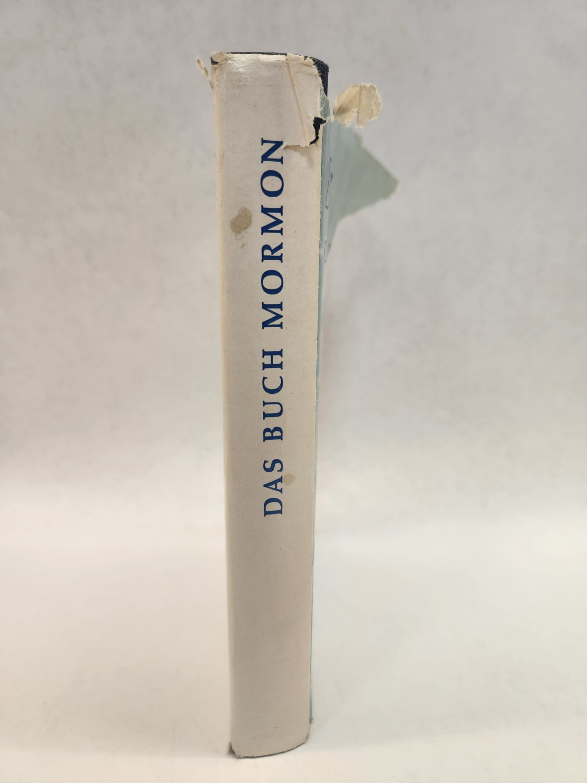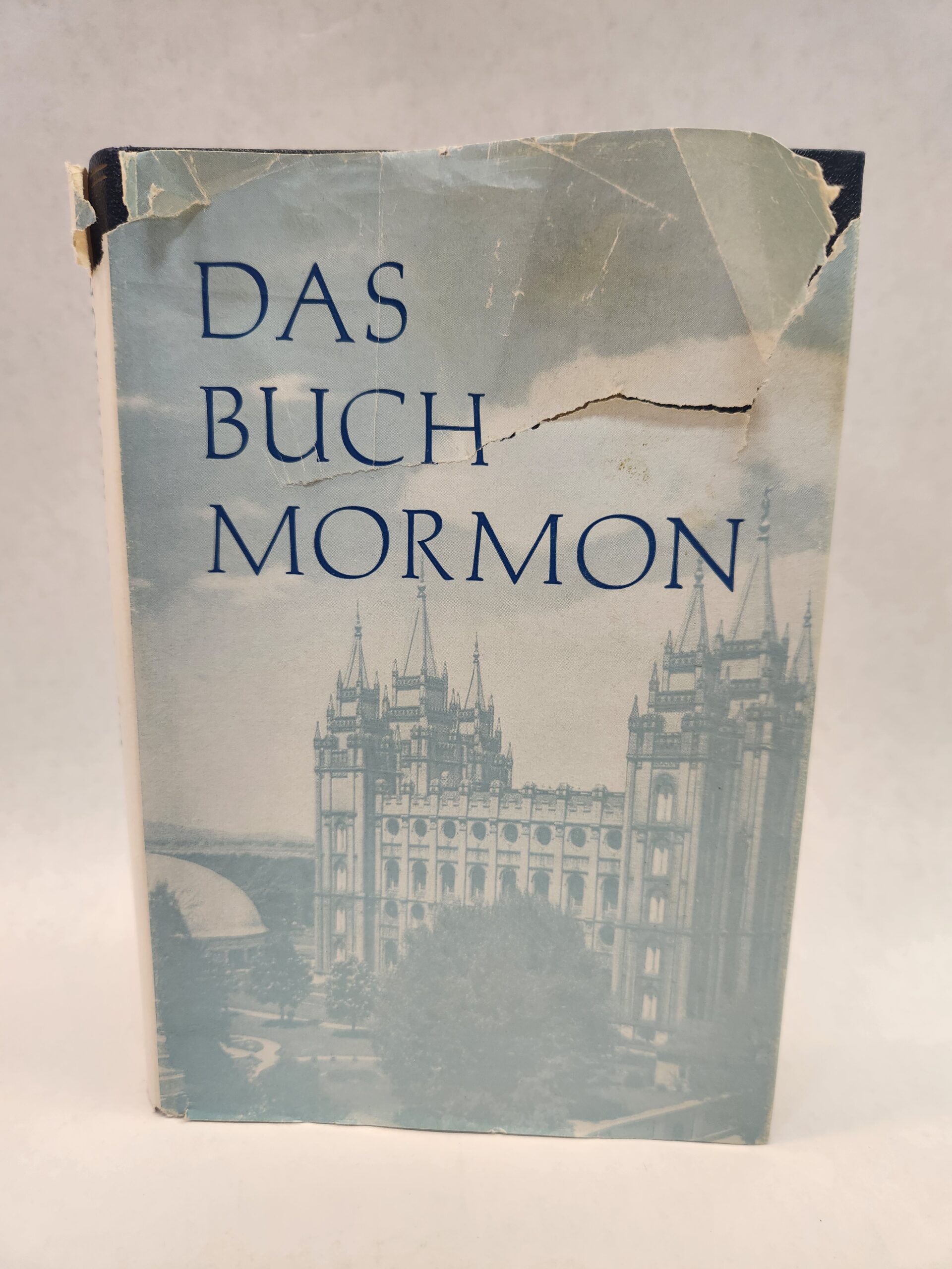 Das Buch Mormon (Book of Mormon in German, 1964, Hardcover w/ Dust Jacket) No marks or writing on the pages. Binding is good. Dust jacket has two diagonal tears (one on the front cover and one on the top of the spine). Corners and edges show some shelf wear. Dust jacket also has some light scratch marks and smudge marks.