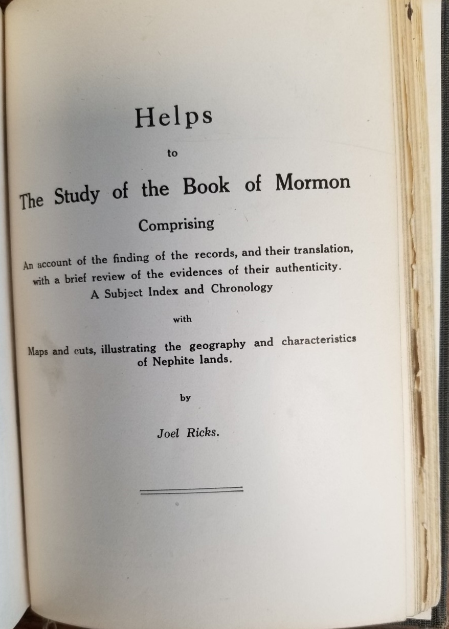 It is the First Independence Edition, and it has the very rare additional section in the back, by Joel Ricks, called Helps to The Study of the Book of Mormon, Comprising An account of the finding of the records, and their translation, with a brief review of the evidences of their authenticity. A Subject Index and Chronology with Maps and cuts, illustrating the geography and characteristics of Nephite Lands. By Joel Ricks. 1916. 88 pages.