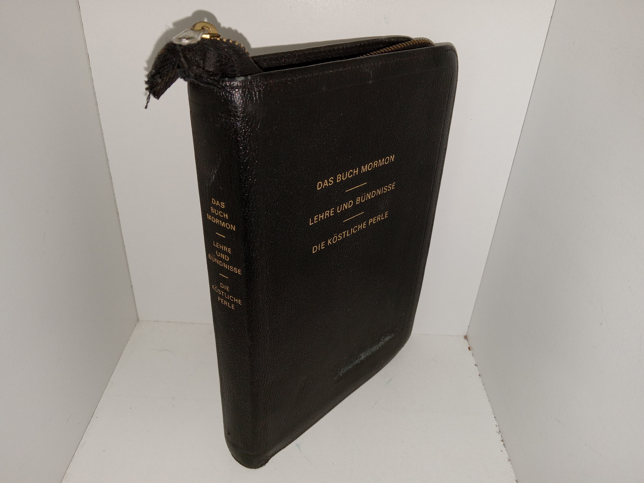Fair condition, black, vinyl book with a zipper seal. The cover has the remains of an inscribed name that had been heavily scratched off. The second flyleaf has some writing in pencil. Some pages have highlighting in pencil, but the text throughout is clear and legible.