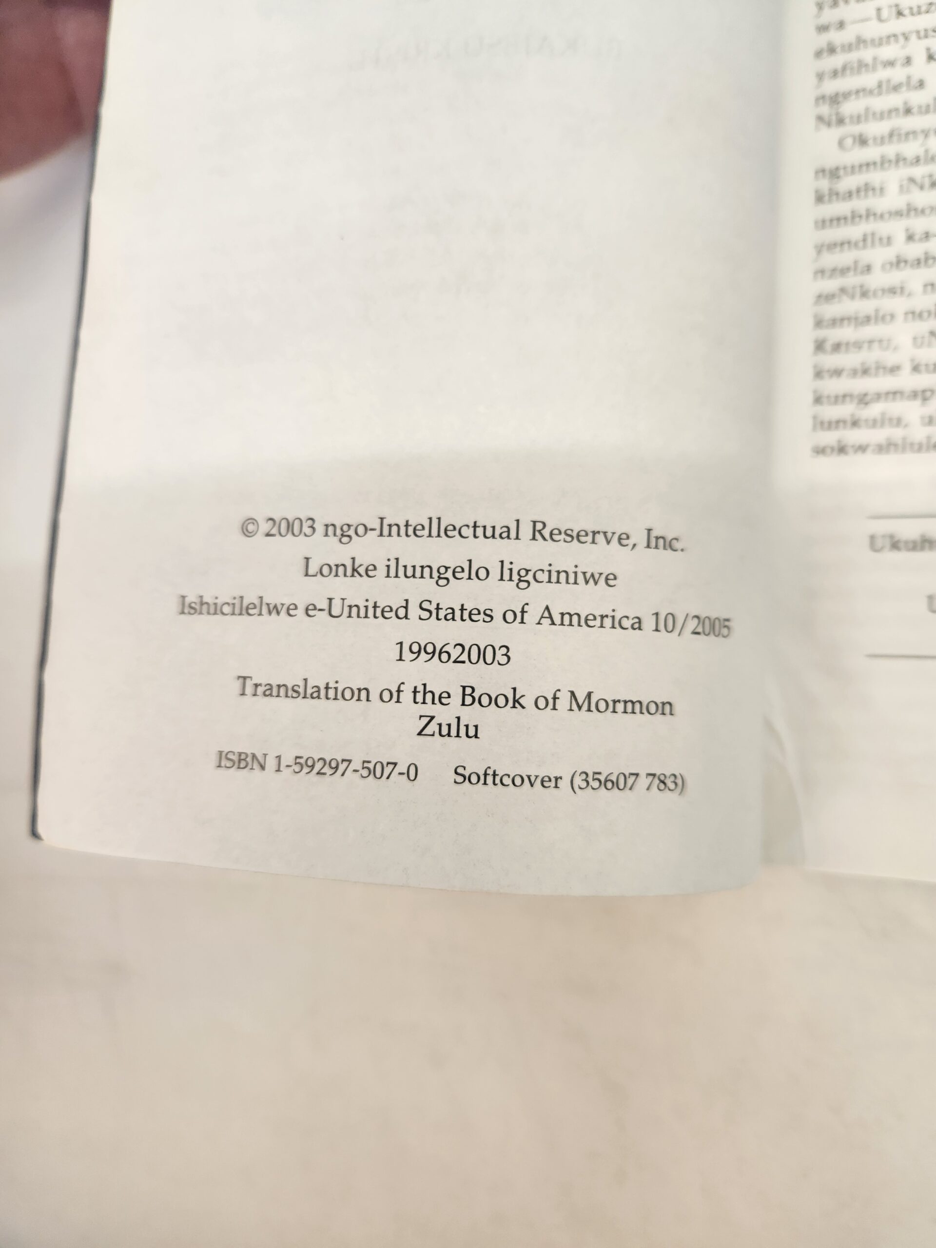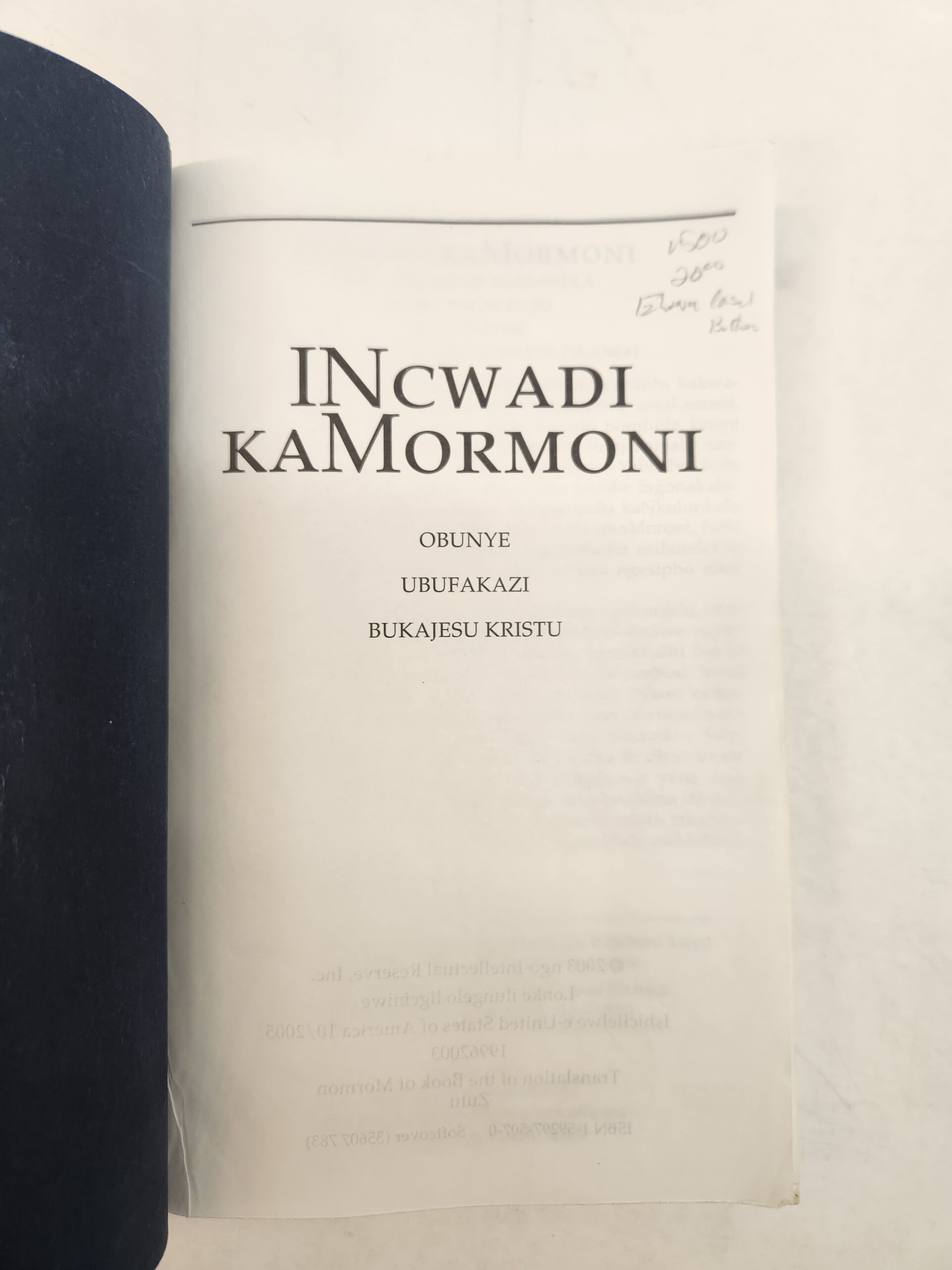 Incwadi Kamormoni:: Obunye Ubufakazi Bukajesu Kristu (2005, Translation of the Book of Mormon into Zulu, Softcover) No marks or writing on pages. Corners and edges show wear with bent corners and light scuffs. Binding is good. Page edge ends has some smudge marks.
