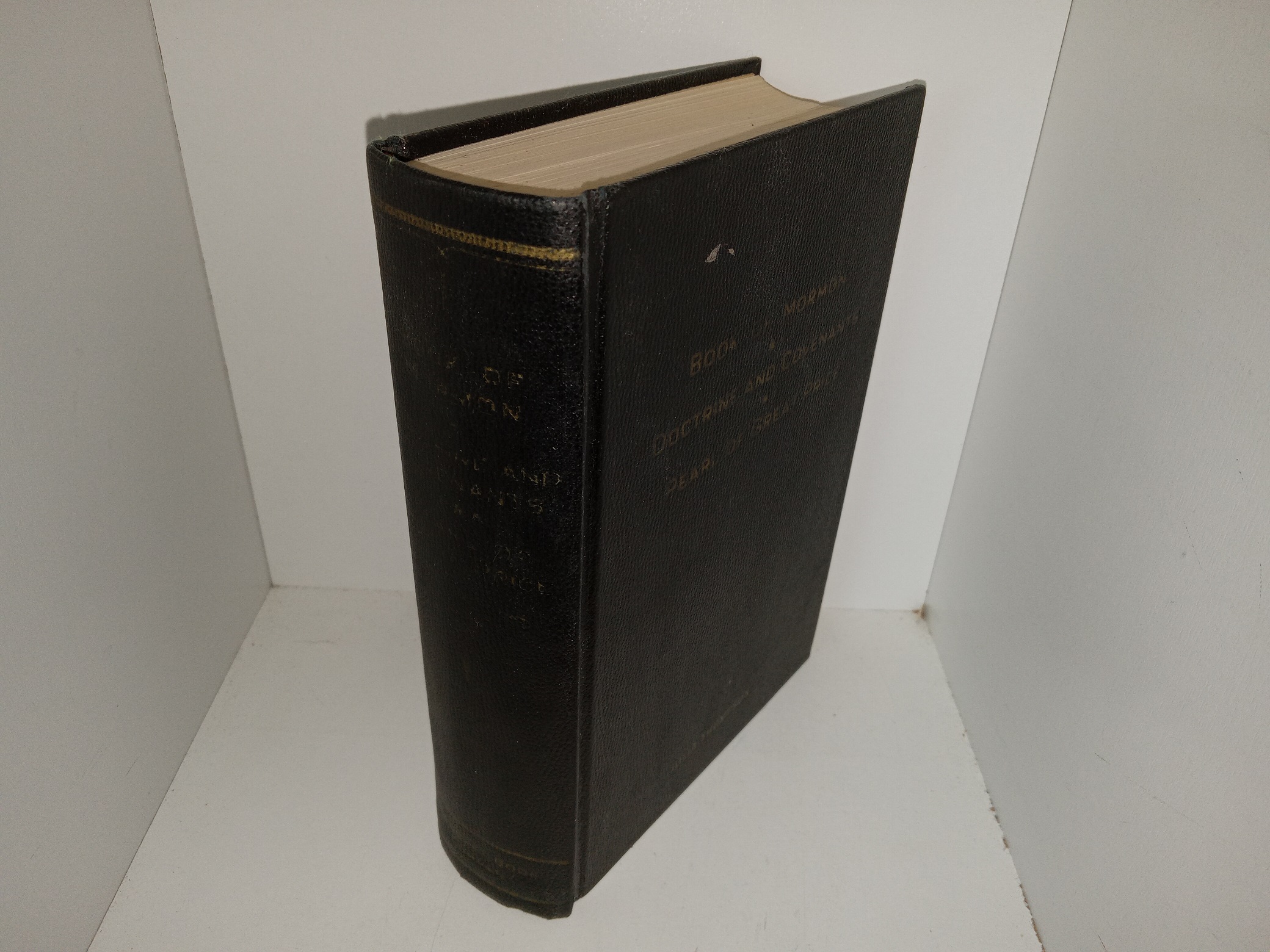 Fair condition, black hardcover with no dust jacket. The cover has heavy scuffing, some fading, some residue, and the name of a previous owner engraved on the front. The inside covers have large patches of adhesive residue along the edges from where tape was removed. Some pages have stains, but the text and illustrations throughout are clear and legible. The front flyleaf has writing in pencil and eraser marks.