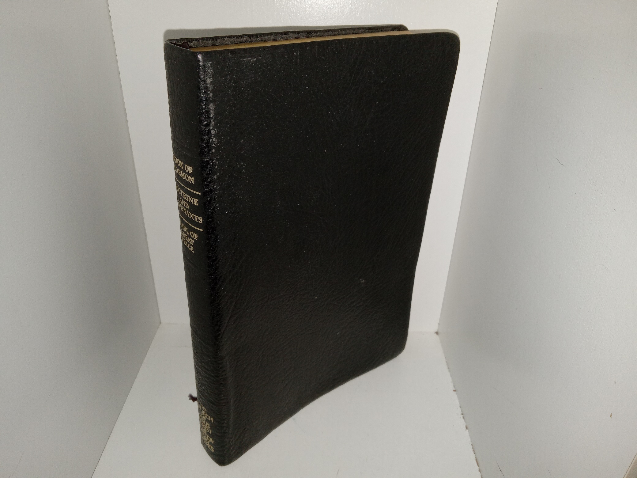 Fair condition, black, leather-bound book. The cover has some scuffing. Some pages have wrinkling, writing or marks in pen or pencil, or eraser marks.