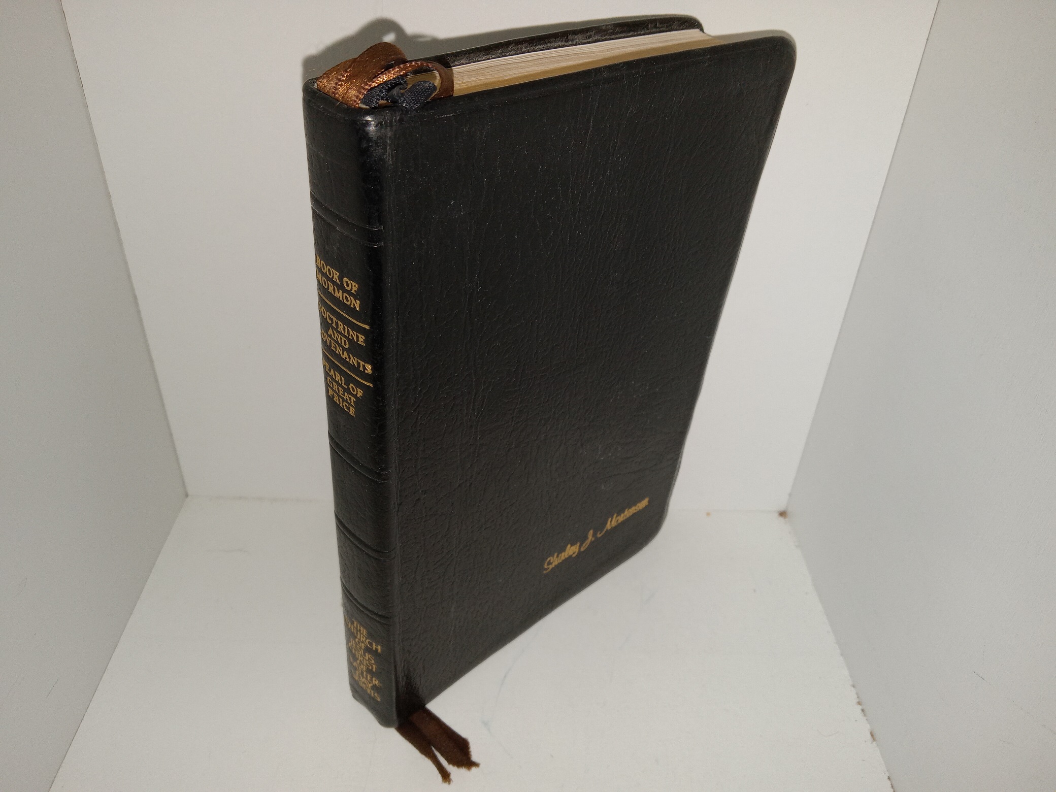 Fair condition, black, vinyl book with three ribbon bookmarks. The cover has the name of a previous owner engraved on the front. Some pages have highlighting in marker, writing or marks in pen or pencil, or eraser marks.